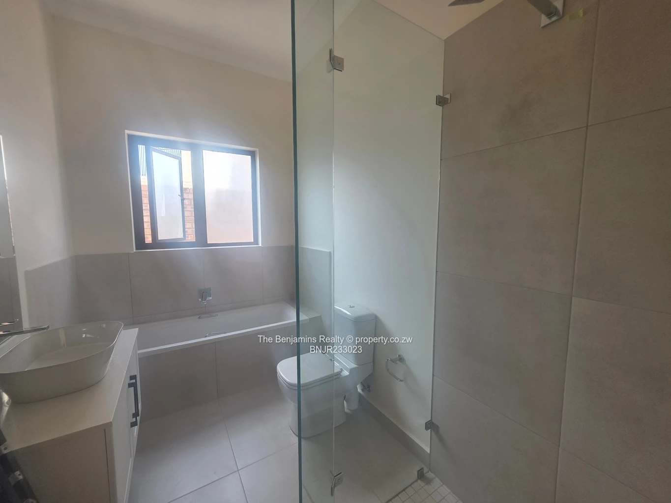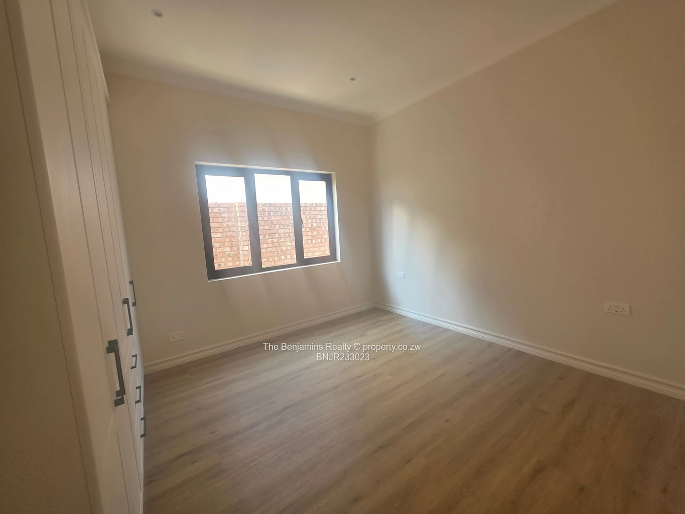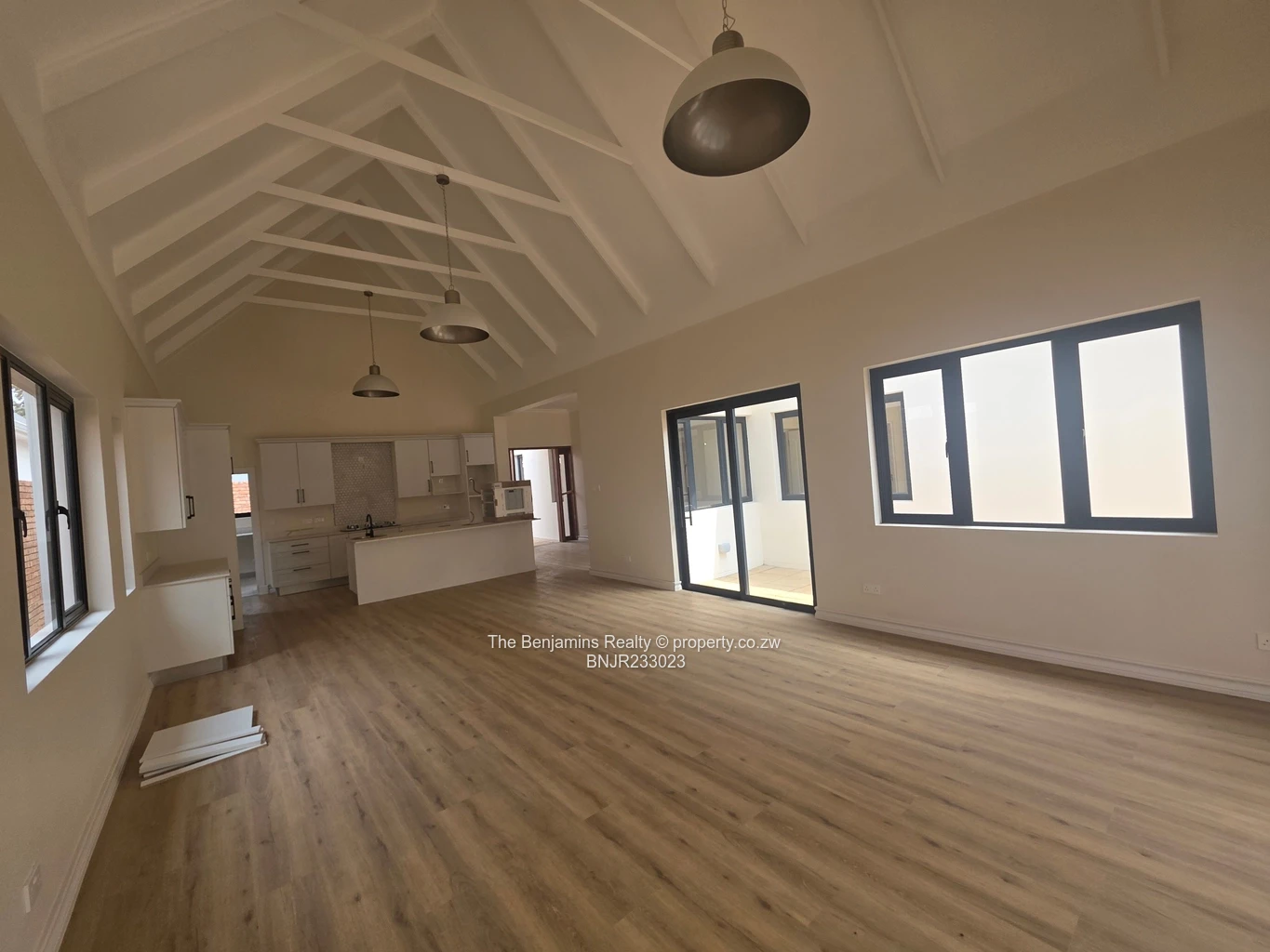 BRAND NEW TOP QUALITY TOWNHOUSE in prime location, close to Sam Levy's Village. This is an upmarket townhouse with excellent finishes. Three bedrooms, three bathrooms. Main bedroom has an en suite .French doors open onto the wonderful sized veranda. The family bathroom services the second bedroom and the third bedroom has an en suite and has a door opening onto a private garden area. A study nook. The kitchen/lounge/dining area is spacious with lots of natural light and high ceilings. The kitchen is fitted with top of the range units and has an oven and hob. Scullery and laundry are found behind the kitchen. There is a kitchen center table. The lounge doors open up onto a well sized undercover veranda which overlooks the pretty front garden. Good borehole. Back up tanks and a good colar system wired throughout the townhouse. Double shade port garage. Good security . Walled, electric gate, electric fence.