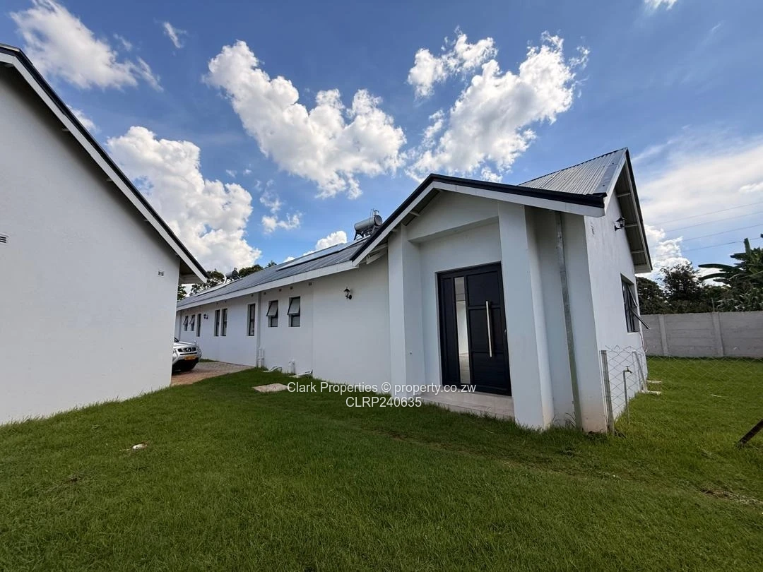 The property features an open-plan lounge, dining, and kitchen fitted with a 4-plate gas stove and oven. Sliding doors that open onto a verandah. Utilities include a prepaid ZESA meter, gas connection, and a borehole for water supply.