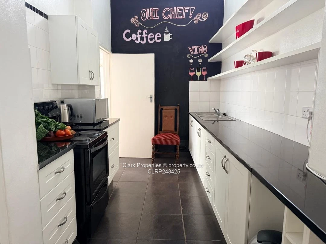 This charming, fully furnished home offers a thoughtfully equipped kitchen with both a four-plate electric stove and a two-plate gas option. There’s an electric geyser for the kitchen and a washing machine is included, adding to the practicality of everyday living. A lounge, featuring a cozy fireplace, flows seamlessly into the dining area. A small courtyard adds a touch of outdoor charm.