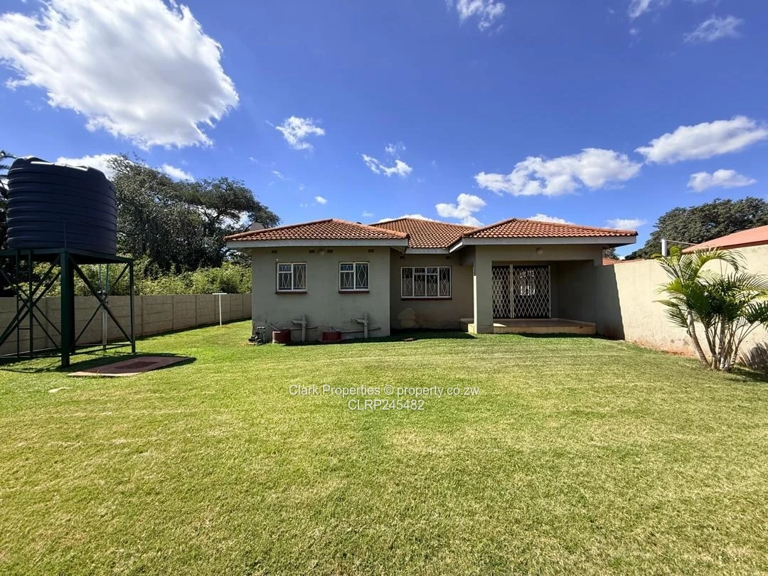 Outdoor spaces include a small garden and a verandah. Practical amenities include a borehole, a 5,000-litre water storage system, a prepaid ZESA meter, a single lock-up garage and a storeroom for extra utility space.