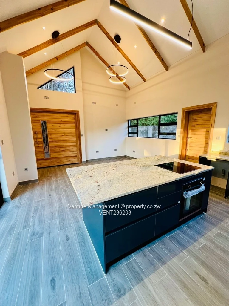 Inside, the open-plan living area impresses with high ceilings and exposed wooden beams, while large glass doors connect effortlessly to the landscaped garden. The kitchen is fitted with sleek cabinetry and a spacious granite island, perfect for cooking and entertaining.