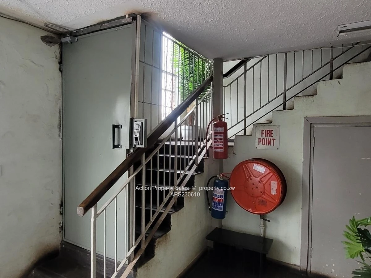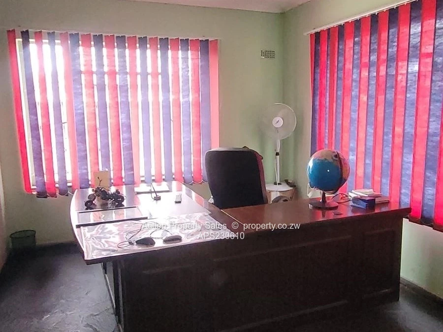 The exterior includes parking space for up to 10 staff cars. Municipal water supply feeding into a 5000L water tank, 3 Phase electricity with a prepaid ZESA meter.