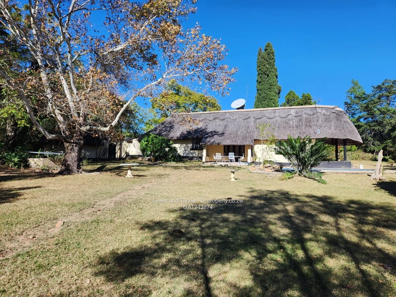 3 bedrooms main ensuite, separate bathroom and toilet. Separate kitchen and a dining room with a sitting room and a sun room all open plan. Attached to the main house, a guest bedroom ensuite and an study room all this is under thatch.
