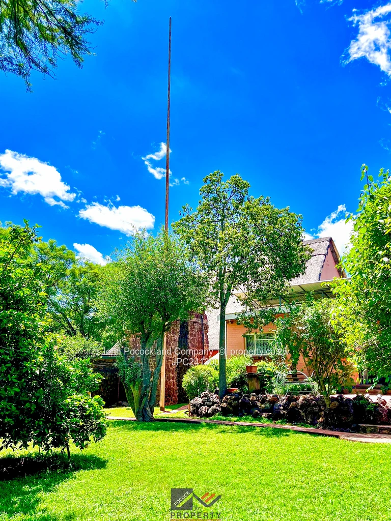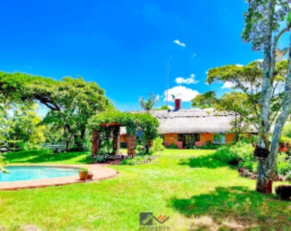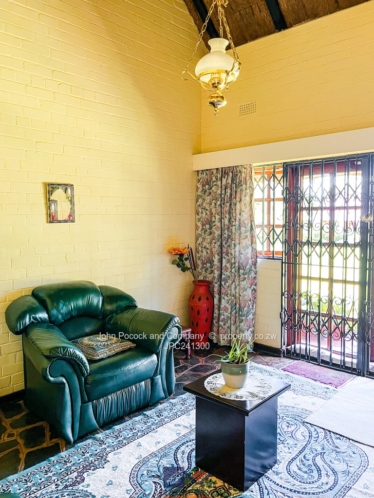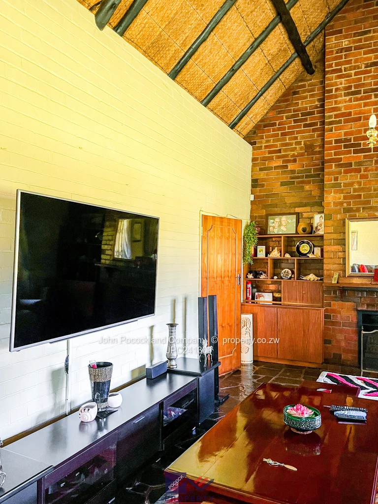 The 2 lounges, dining room and one bedroom en suite are under thatch and the rest of the house has ceiling.