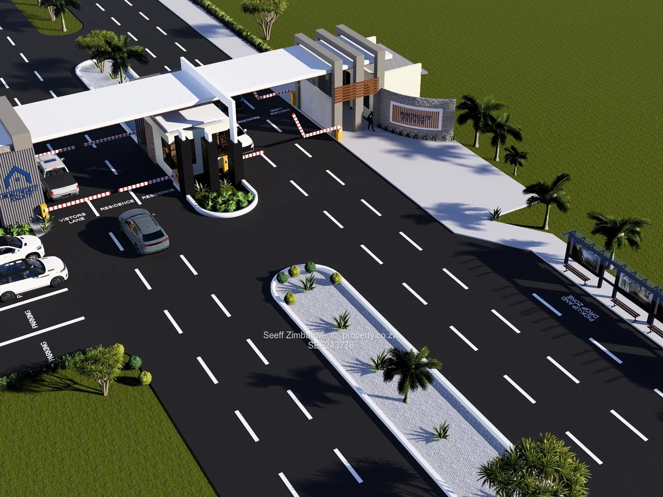 Seeff Zimbabwe is proud to offer these prime commercial & industrial plots for sale in strategic Northgate Estate ,Borrowdale, Harare North — perfect for a small warehouse, workshop, showroom or secure storage yard. Invest into this well-planned housing estate industrial estate under development with newly tarred roads, concrete kerbing and clearly demarcated serviced stands. You’ll see a dedicated water reservoir on site and extensive stormwater infrastructure, plus aerial views that highlight generous road layouts and parcel orientation for easy vehicle circulation and deliveries. A gated entrance and architectural rendering in the gallery indicate estate-wide security and controlled access, ideal for business operations. Close to major arterial routes into Harare, this lot offers strong visibility, fast access for logistics and excellent future capital appreciation as the estate develops.