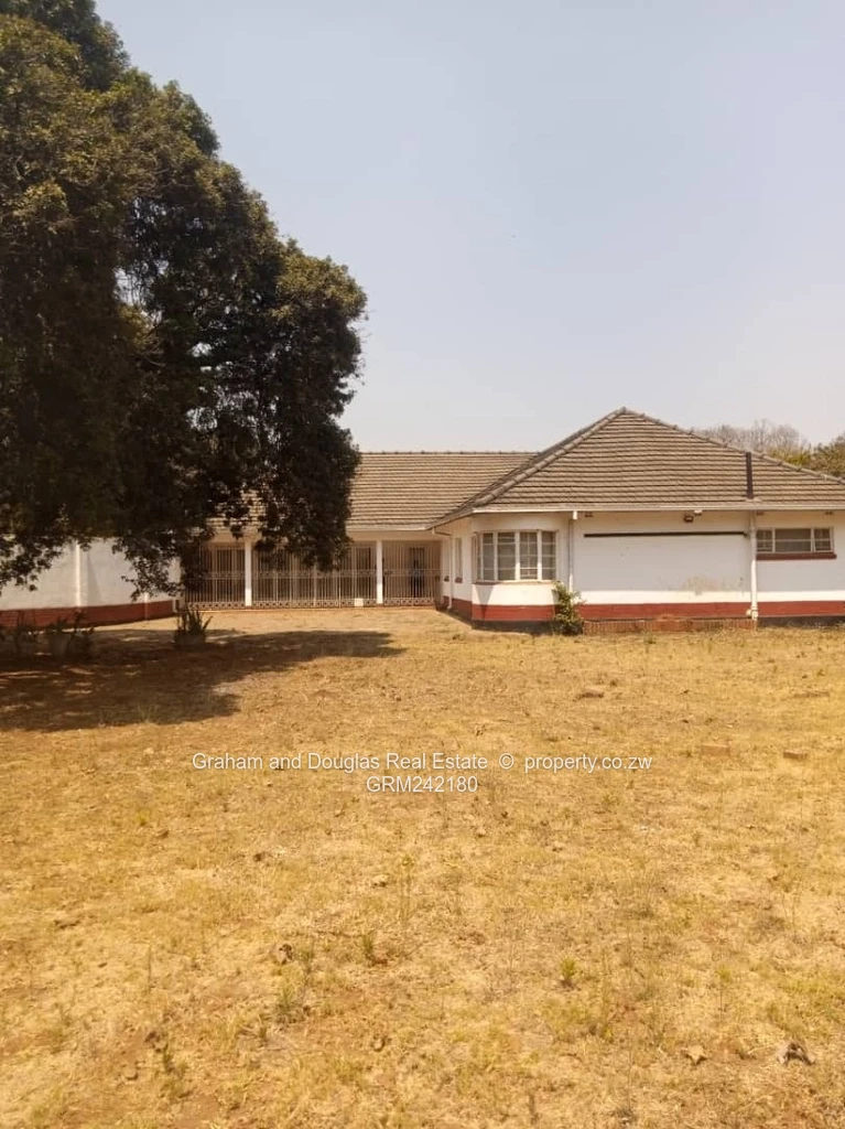 Marlborough along Harare Drive and between Adylinn and Elizabeth Windsor Roads. There is an old 4 bedroomed house mes, lounge, dining, study, kitchen, pantry, toilet, bathroom, 2 passages, 2 enclosed verandahs. Abutting the main house is a garage that can accommodate 4 cars. The garages have screen gates. There is a staff quarters( 2 rooms, toilet/bathrooms).There is a borehole but it has dried-up.There is a disused pool, there are 2 water tank. It is walled and gated. Loam soils. Land area over 9000sqm. Deed. Good area. Lots of potential.