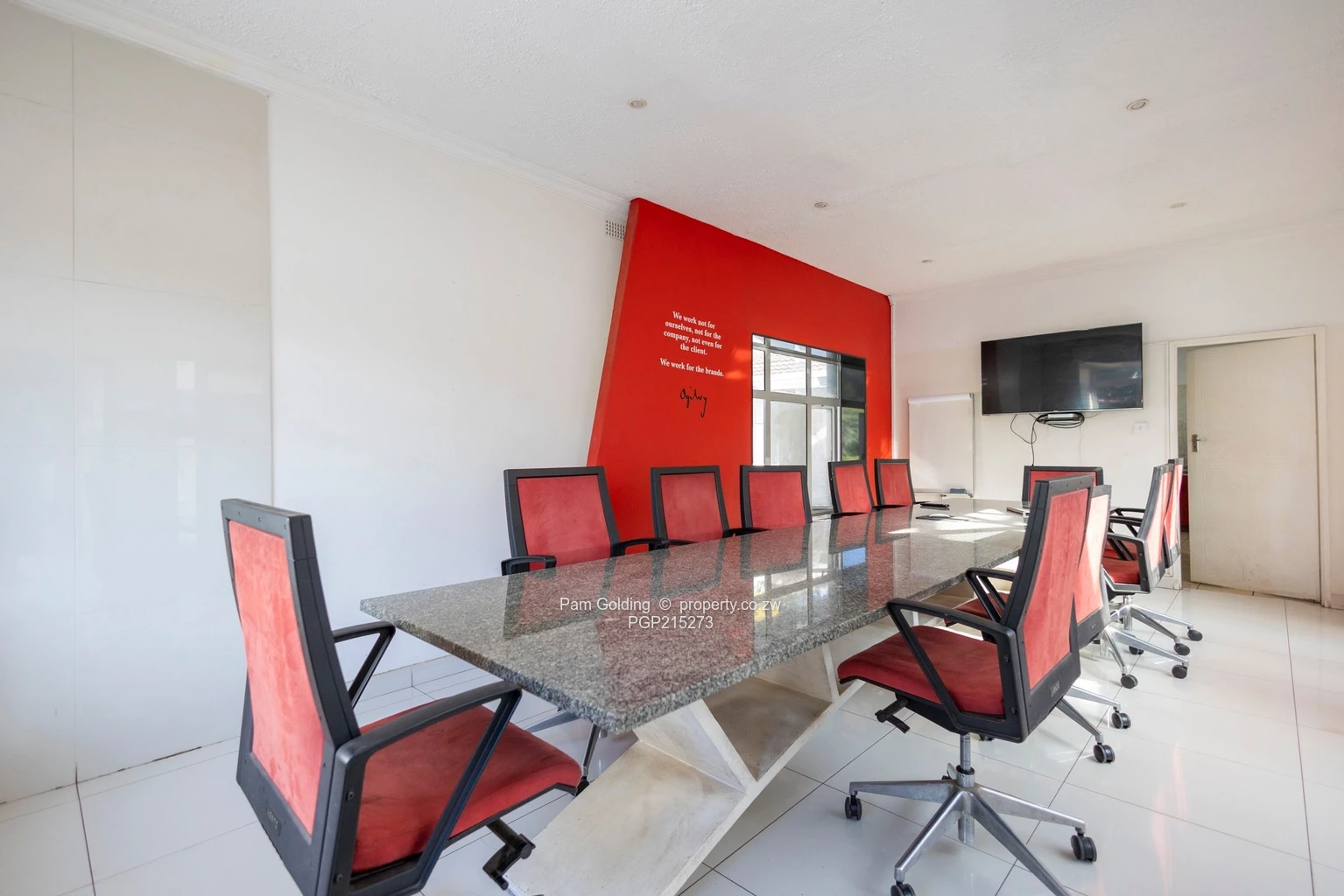 The property includes a boardroom, server room, executive bathroom and staff bathrooms, a fully equipped kitchen and pantry, and a dedicated entertainment area with a bar overlooking the pool.