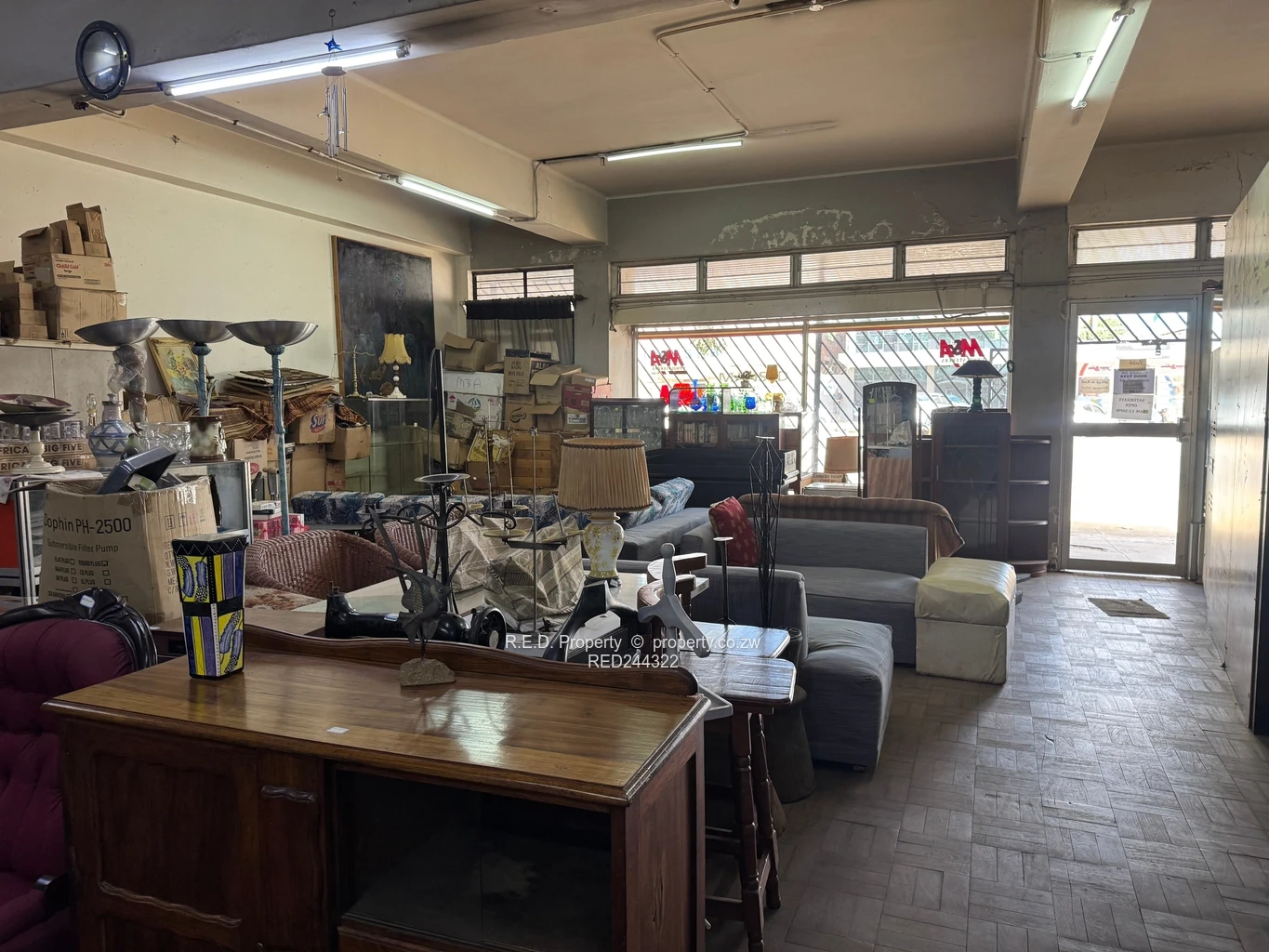 The front section of the property features a spacious shop area measuring approximately 182 sqm, complete with glass frontage and burglar bars, providing excellent visibility and security. The flooring in this section comprises parquet and grano, making it suitable for showroom or retail use. A driveway measuring 69 sqm runs alongside the building and provides convenient access to the warehouse area at the rear.
