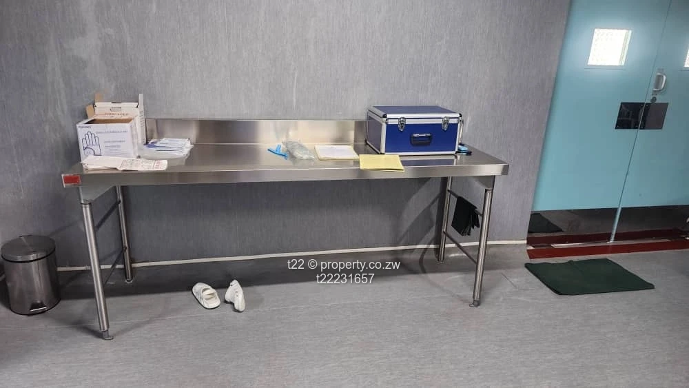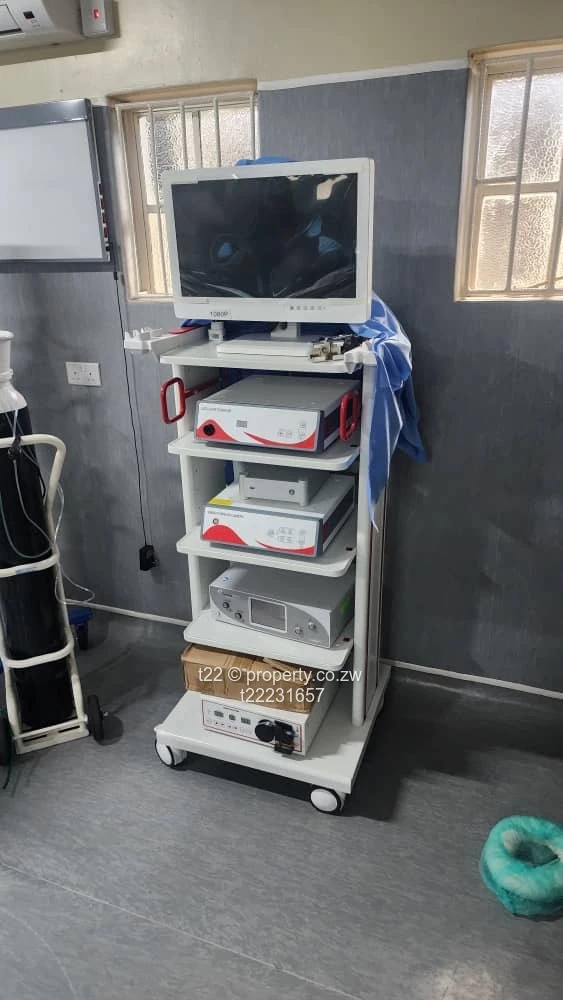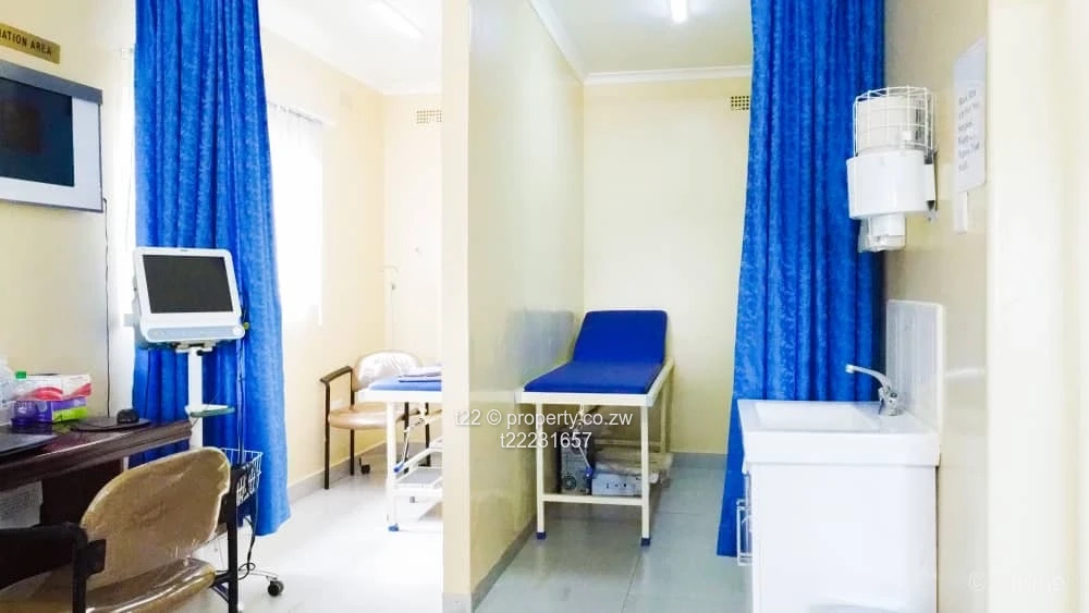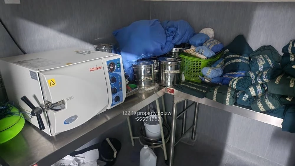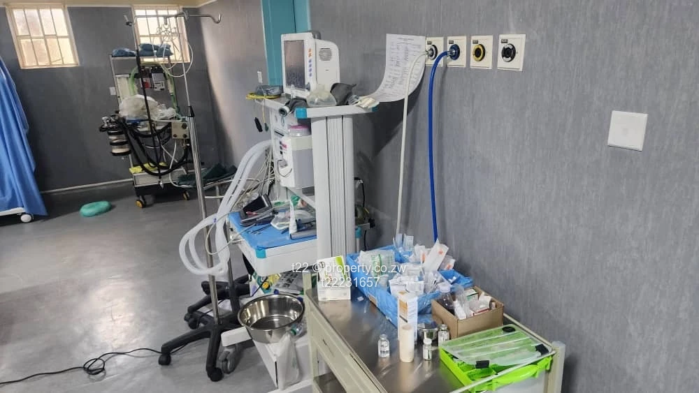 Internally the layout is arranged for clinical use and presents extremely well: welcoming reception and waiting area, nurses’ station, multiple consultation and examination rooms, dedicated ophthalmology suite with specialist chairs and slit-lamp equipment, sterilisation and surgical store rooms, fully fitted theatre/operating room with surgical lights, anaesthesia and monitoring equipment, stainless steel prep benches and autoclave area, baby/neo-natal station and clinical support rooms. The interiors are tiled and well lit, with air conditioning units visible in key rooms and sensible clinical finishes throughout — ideal for an established medical practice, day surgery, specialist clinic or diagnostic centre. There is also a practical staff kitchenette and storage shelving, making daily operations efficient.