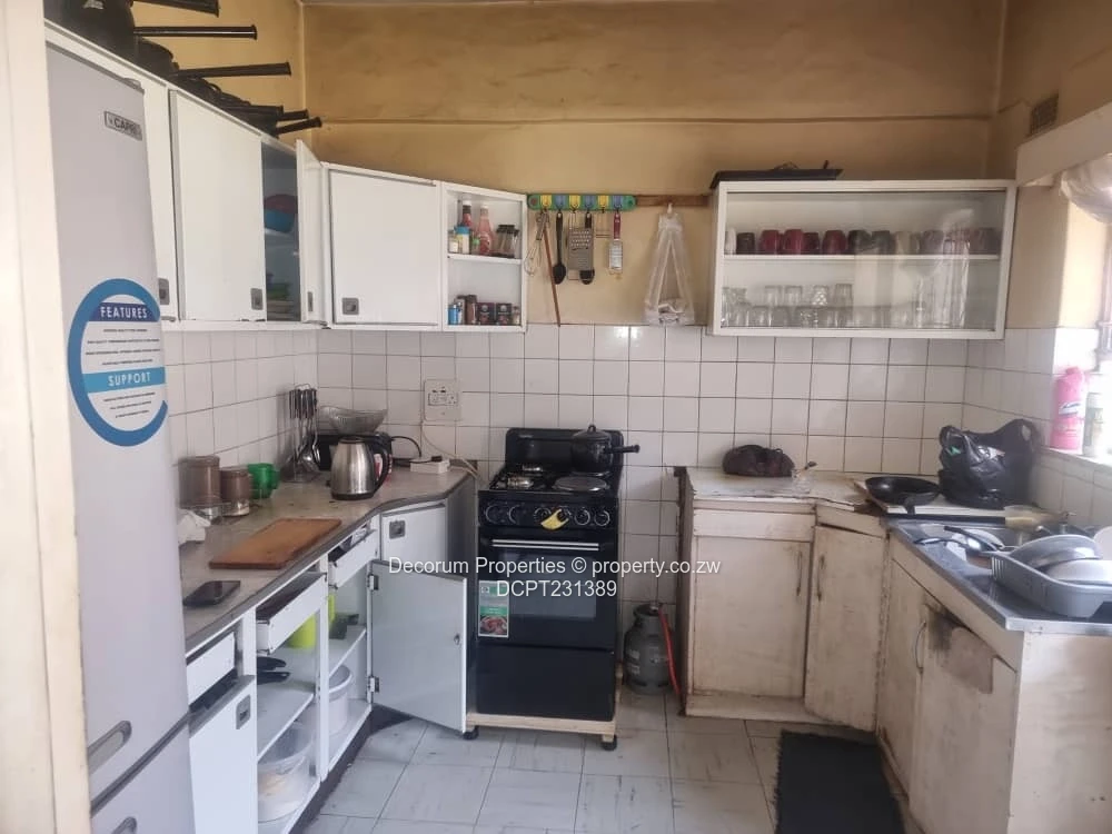 Charming 2-bedroom, 1-bathroom ground-floor apartment for sale in Eastlea, Harare East — ideal starter home or smart rental investment. Set in a solid red-brick three-storey block on a well-sized 2,000 m² plot (building footprint approx. 500 m²), this unit features a secure, enclosed verandah with steel burglar guards shown in the photos, a bright living/dining area with original parquet floors and high textured ceilings, and a practical fitted kitchen with overhead cupboards, freestanding stove and space for appliances. The bathroom is half-tiled and the apartment benefits from good natural light through latticed windows.