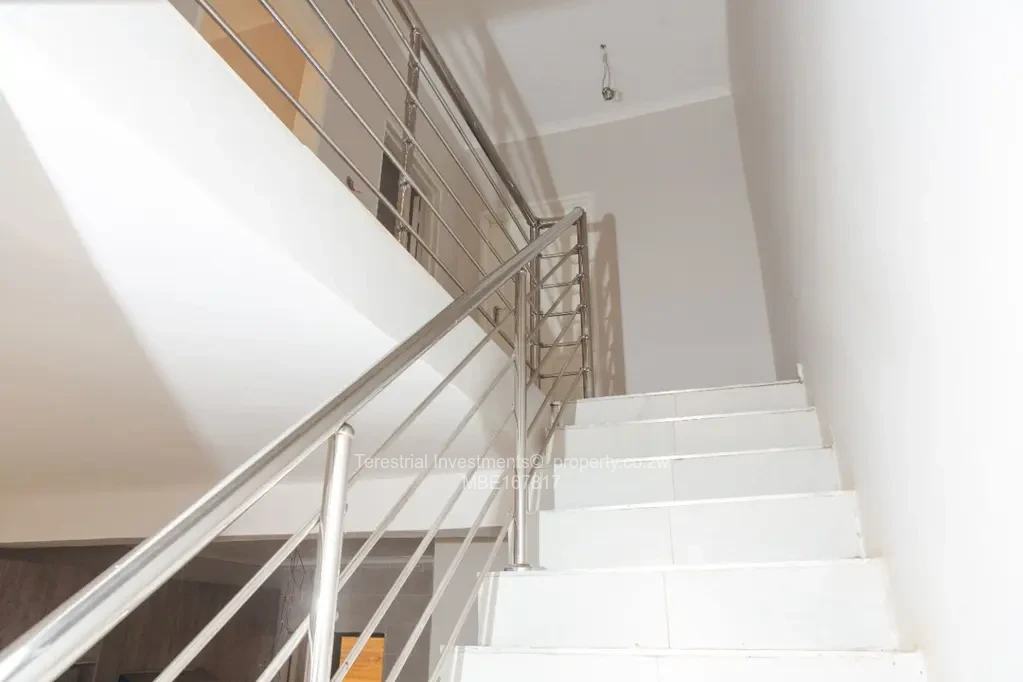 A two-bedroomed furnished apartment with separate bathroom and toilet upstairs with a balcony. Open plan kitchen with fitted cabinets, dining & lounge with a display & storage cabinet, 1 separate visitors’ toilet on the ground floor. Outside braai space.