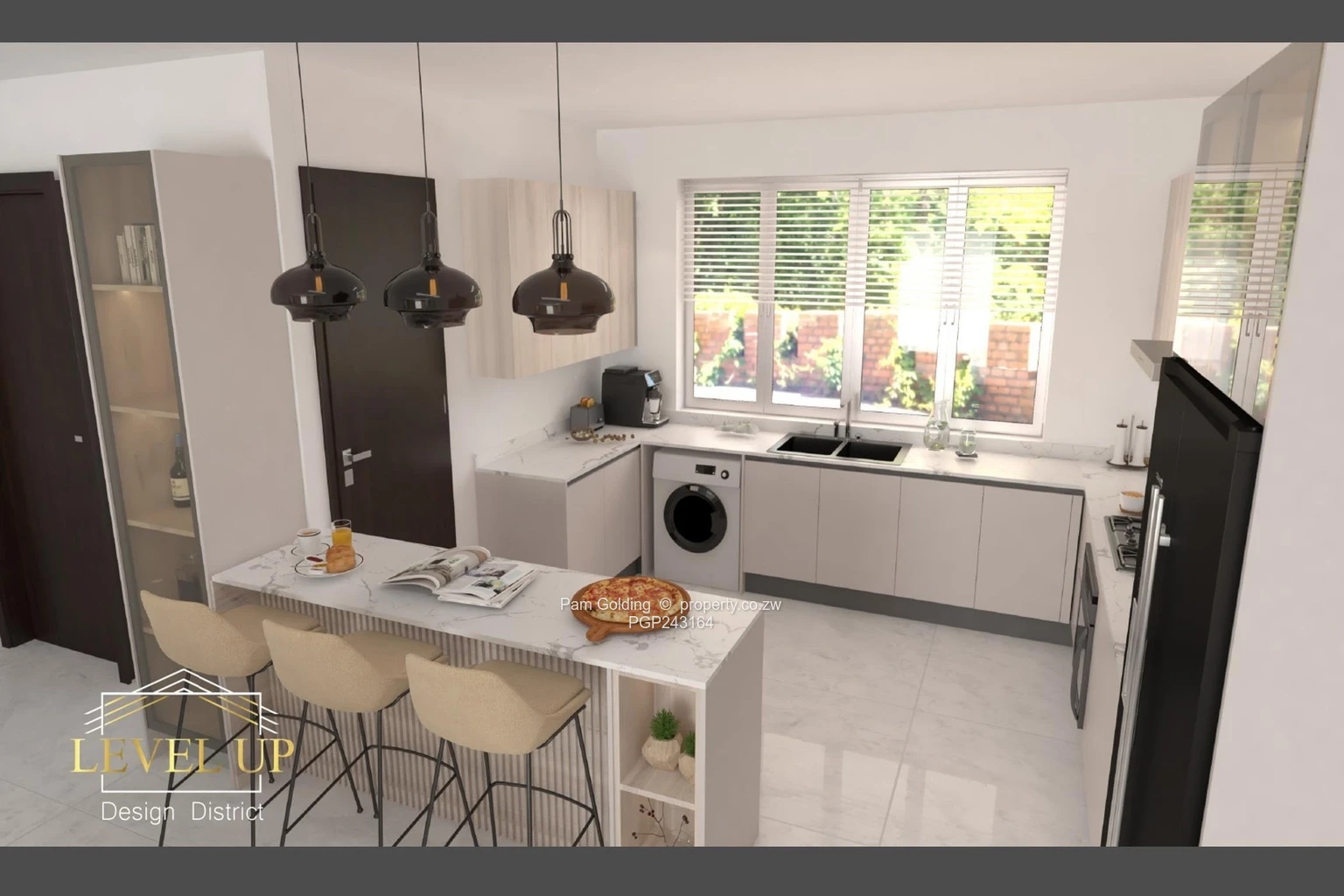 The modern kitchen is stylish and functional, fitted with contemporary cabinetry, quality countertops, and ample storage space to meet all your cooking needs.