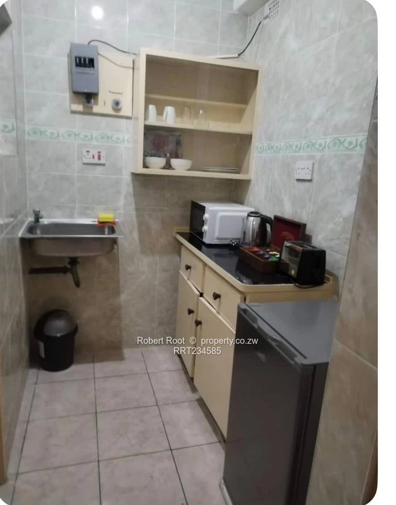 Neat, and renovated bachelor apartment in the heart of Avenues, Harare CBD — perfectly sized for a single professional, couple or investor. This walled 100 m² stand hosts a neat 50 m² flat with secure entrance and visible burglar bars on the bathroom window. The interior is tiled throughout with modern grey floor tiles in the bedroom and living area and fully tiled bathroom boasting a full bath, basin and WC (light, airy window with curtain shown in photos). The bedroom includes a built-in wardrobe and sleeps comfortably as pictured. The kitchenette is efficiently laid out with tiled walls, sink, countertop storage and space for a fridge and small appliances (microwave and kettle shown). Municipal water supply, well-maintained finishes and practical layout make this unit move-in ready or ideal for immediate rental income. Located within walking distance of shops, banks, restaurants and public transport in Avenues — urban convenience and security combined. Arrange a viewing today to see this tidy, centrally positioned flat for yourself.