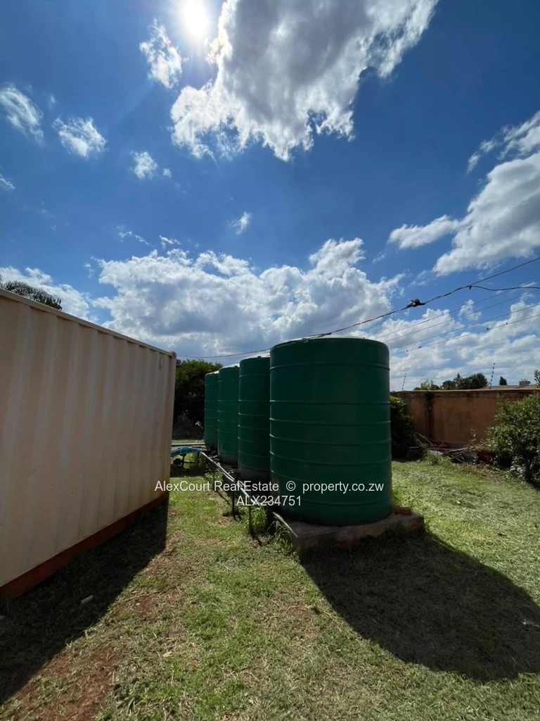 The home comes with a generator for backup power, a 5kVA solar power system, and a functional borehole. It also includes a storage container for reuse, a freezer, and two-bedroom staff quarters, featuring a garden with a fitted kitchen.