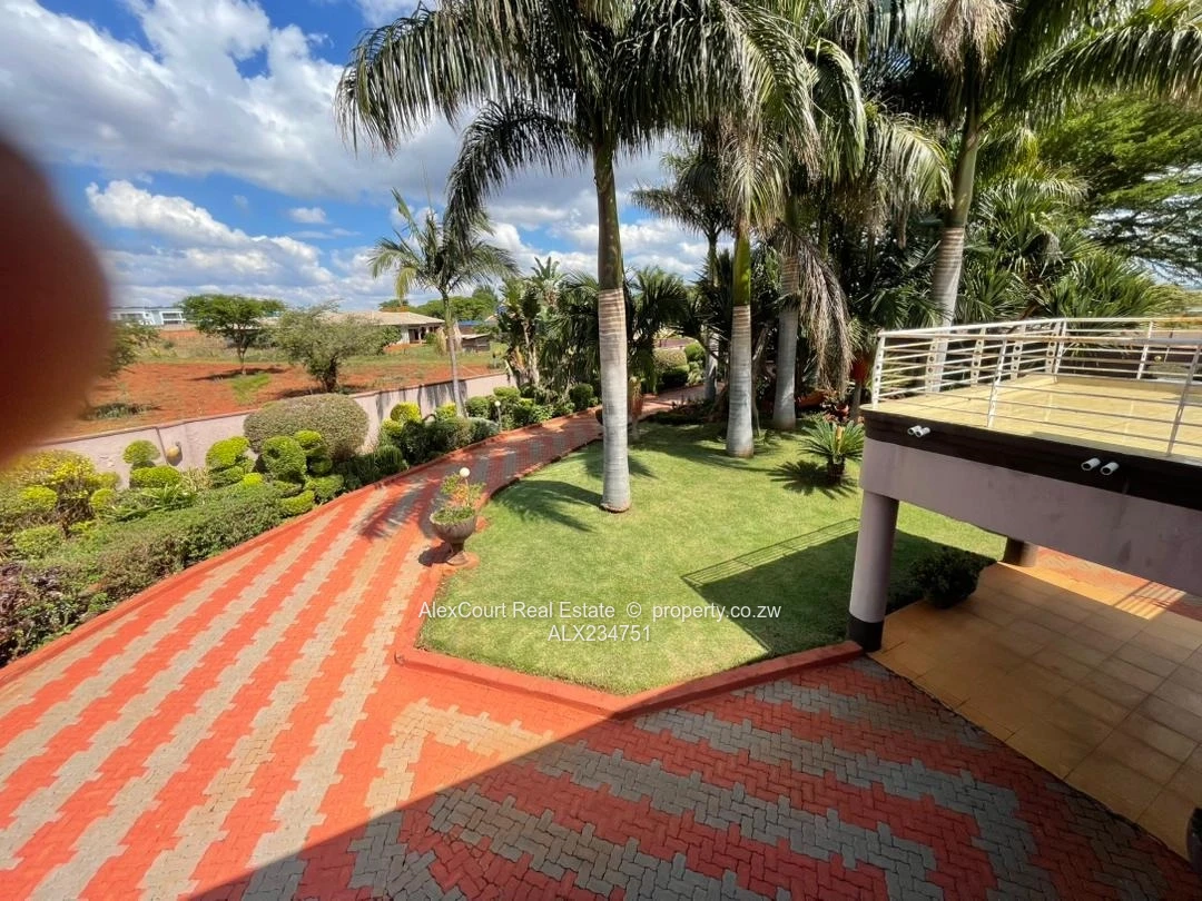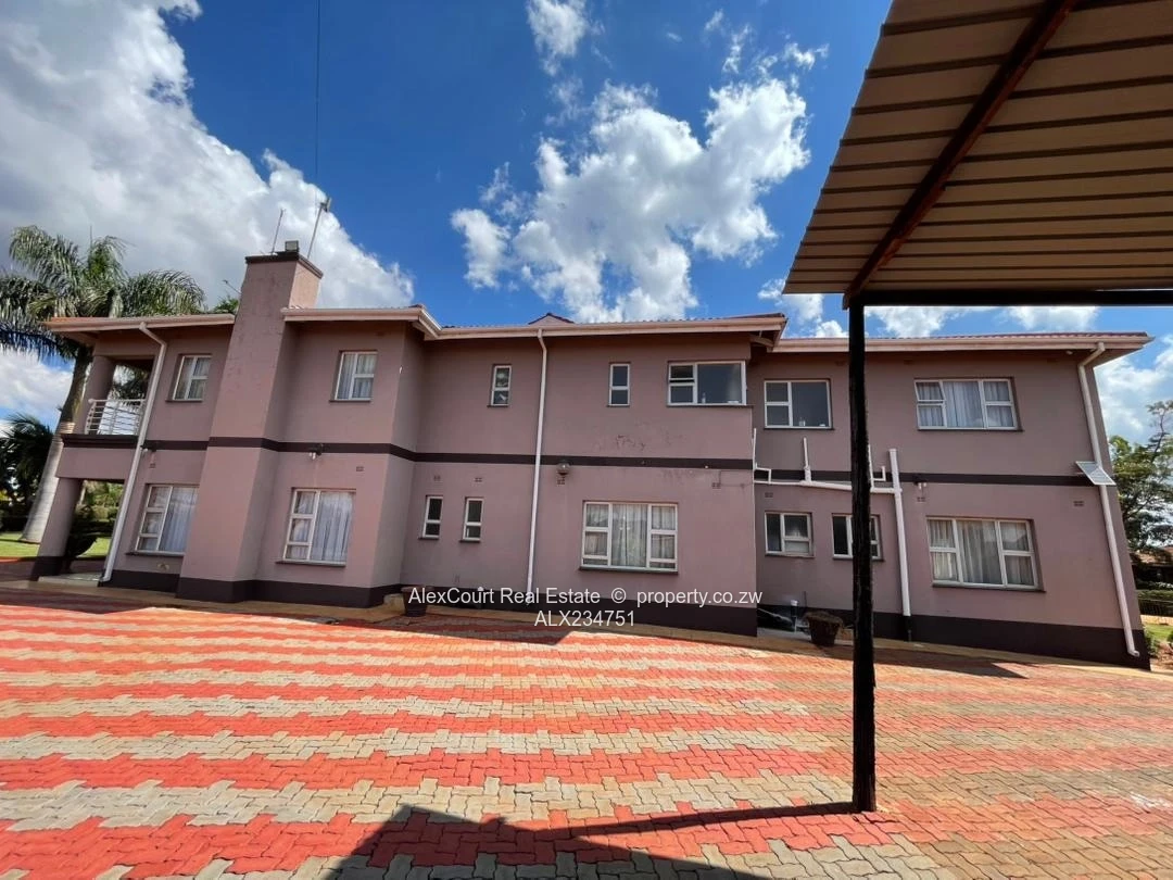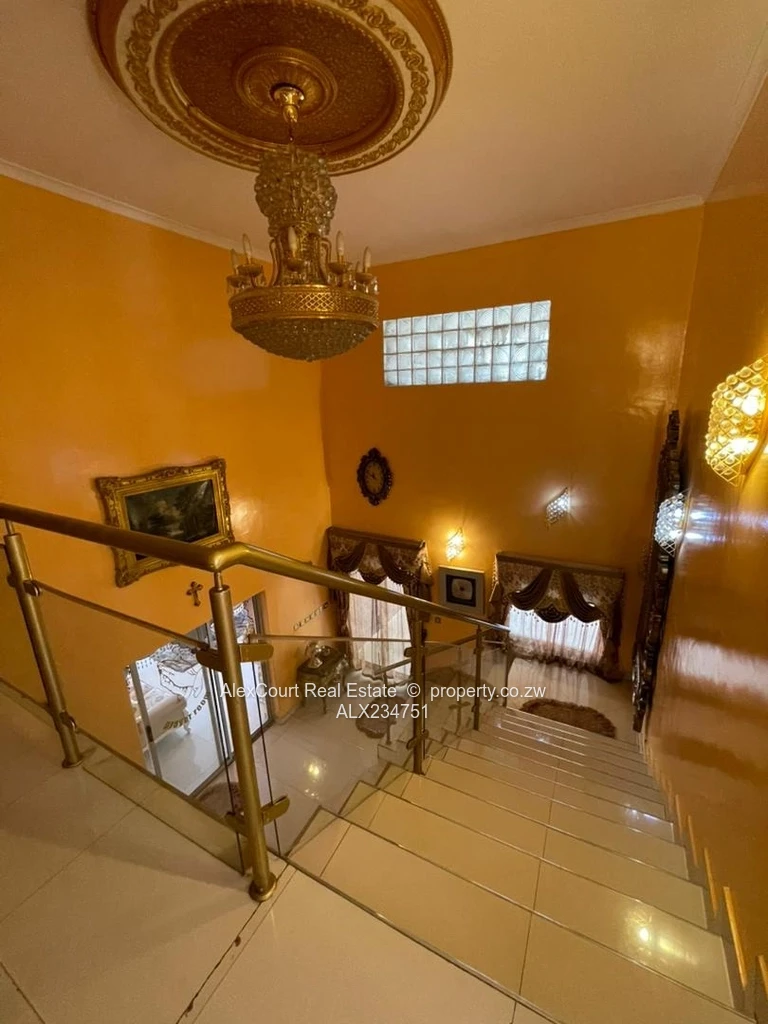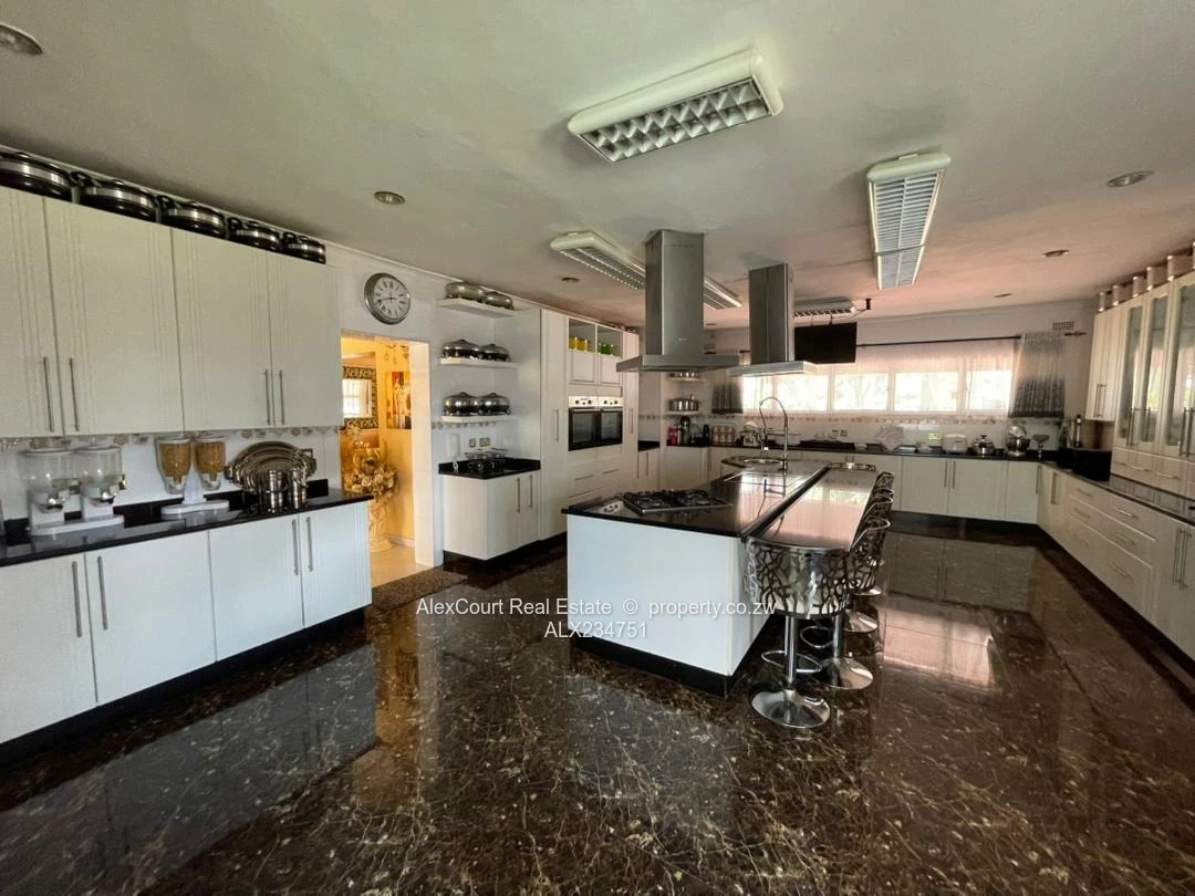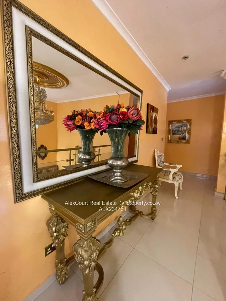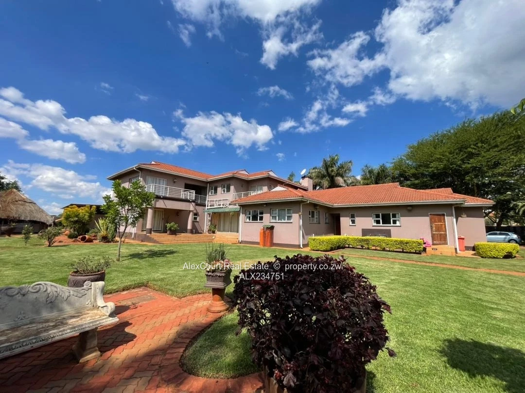 This elegant double storey six-bedroom house features all ensuite bathrooms, with four upstairs bedrooms opening to a private balcony. It includes walk-in closets, a fitted kitchen with a walk-in pantry, a laundry room, and a scullery, alongside a neat dining area and three separate lounges.