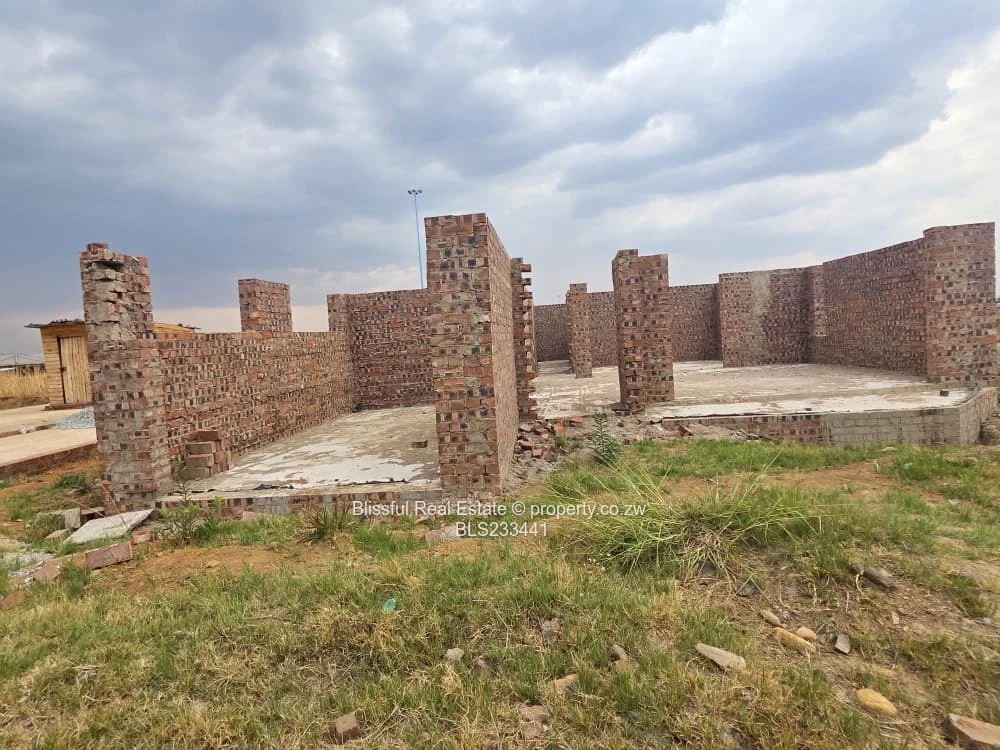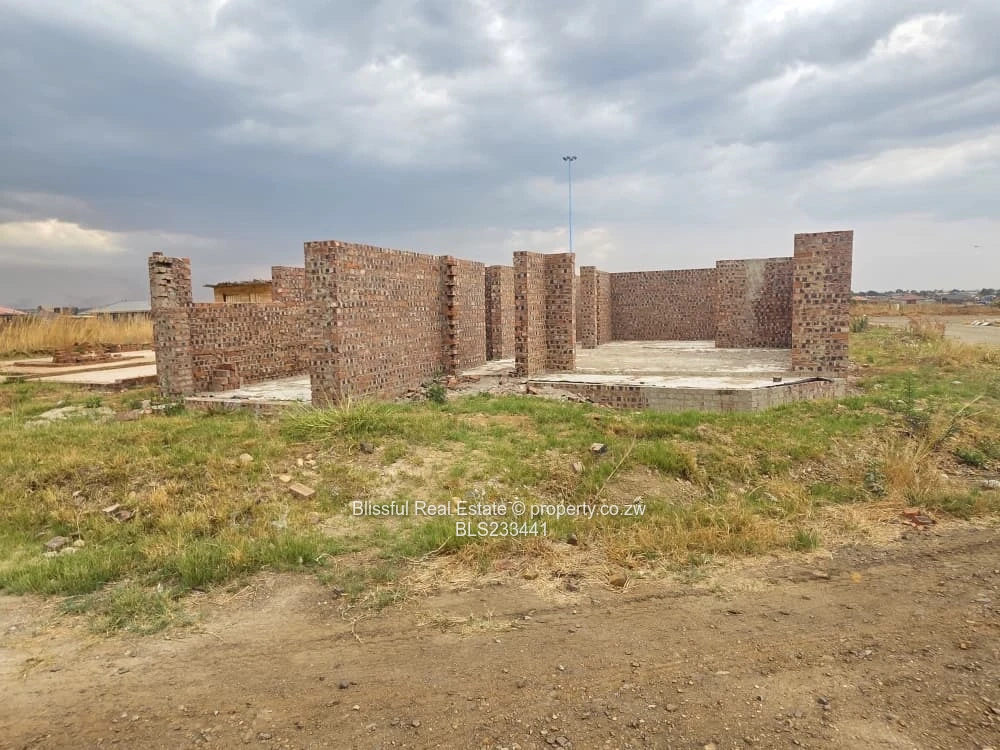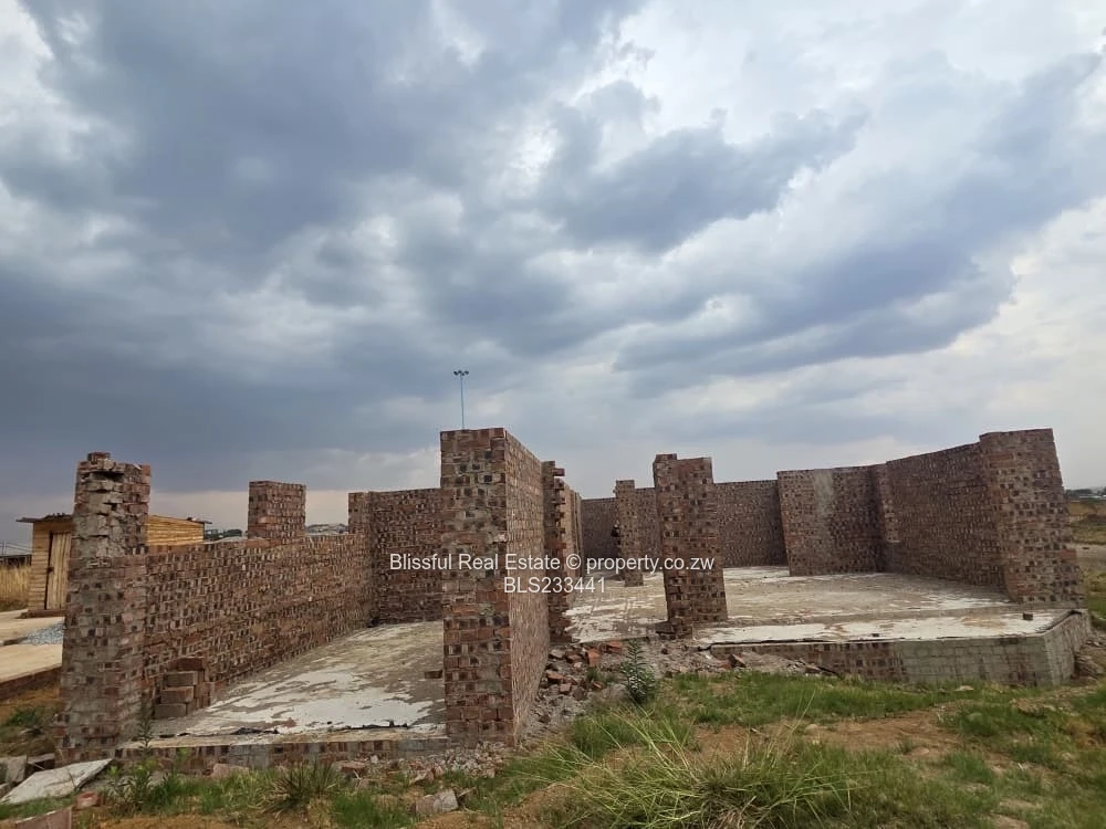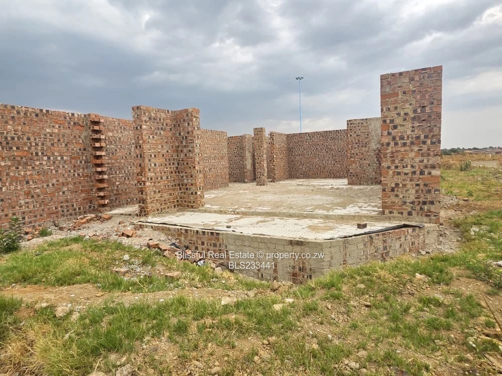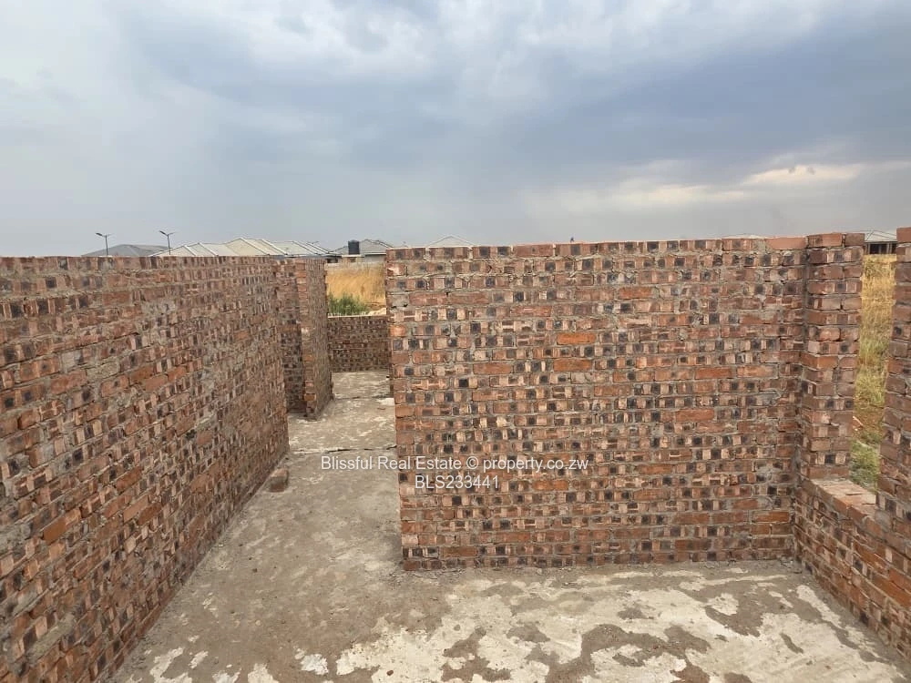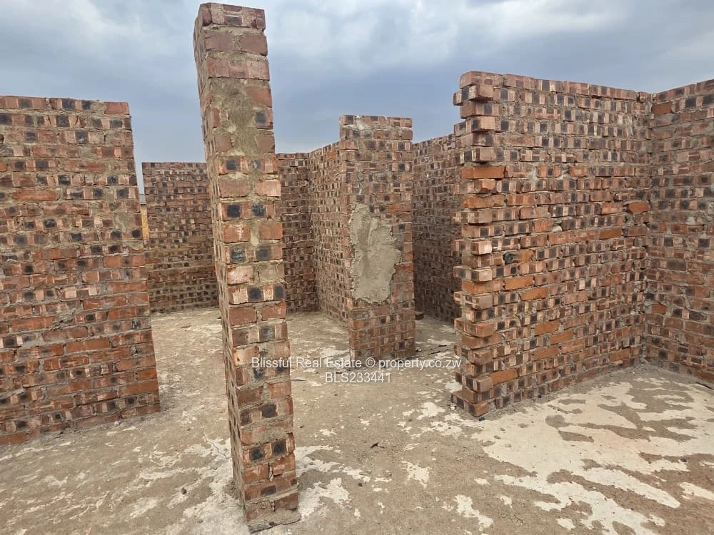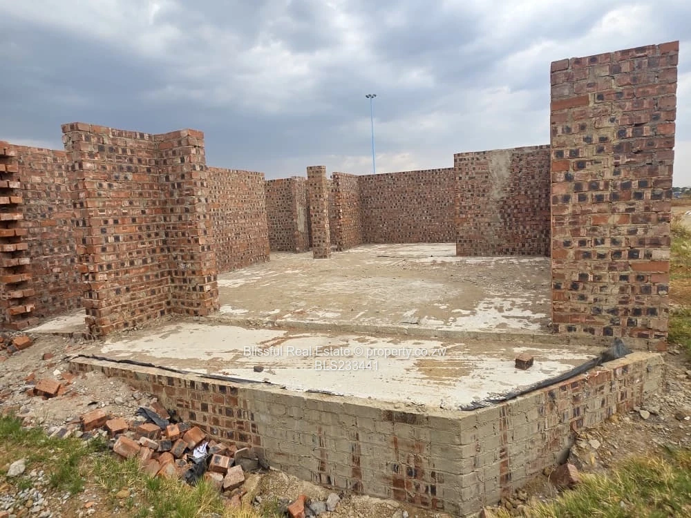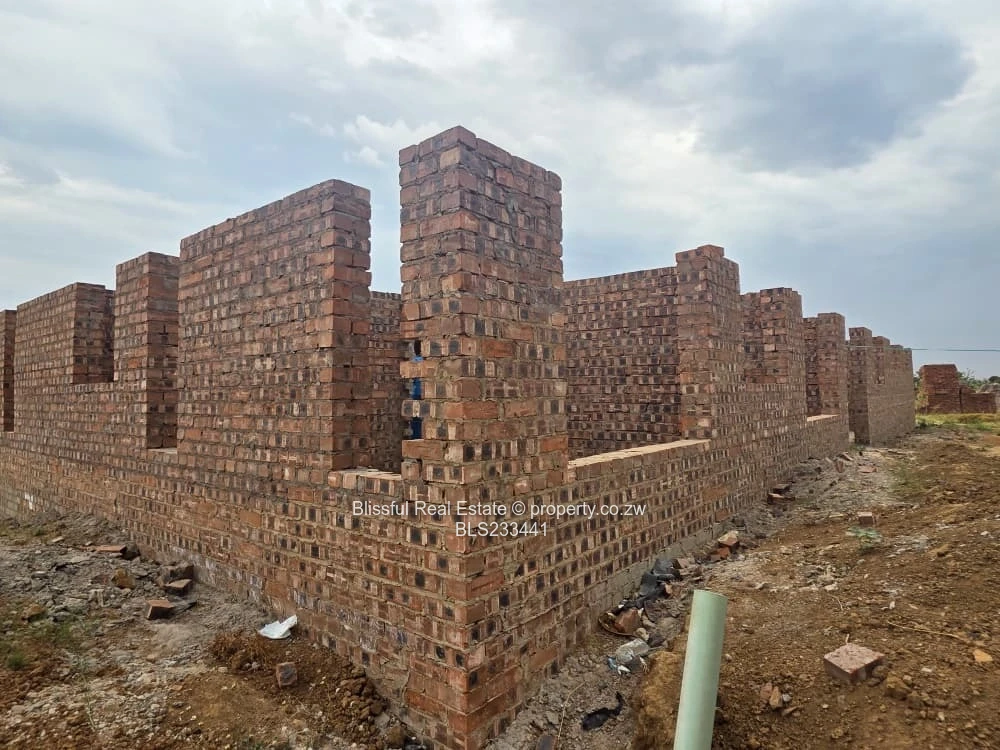 In Glaudina, an incomplete three-bedroom house features a simple rectangular design. The exterior walls are partially constructed, and the two bedrooms near the front are close to tarred roads, ensuring easy access. Windows are framed but unfinished, allowing light into the spacious rooms. The open-plan living area and kitchen are also in a rudimentary state. The surrounding yard is likely overgrown, waiting for landscaping, while the location near main roads enhances convenience.