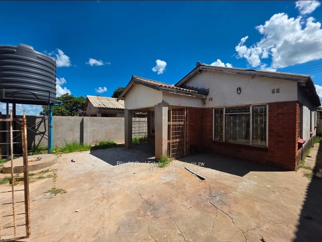 Neat family home for sale in Chitungwiza Unit M, comprising a lounge with verandah, fitted kitchen, main bedroom with a built-in cupboard, three additional bedrooms, and a combined bathroom and toilet. The property is well supported by a 5000-litre water tank and septic tank, and is securely walled and gated