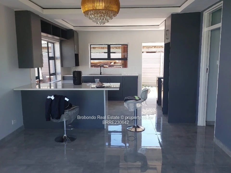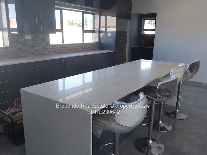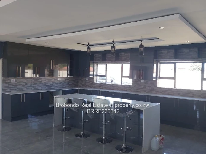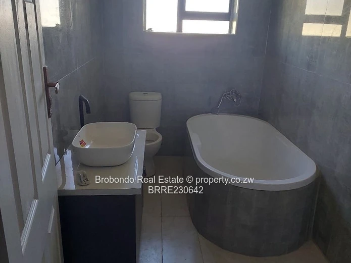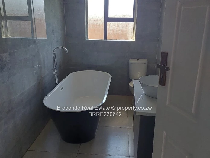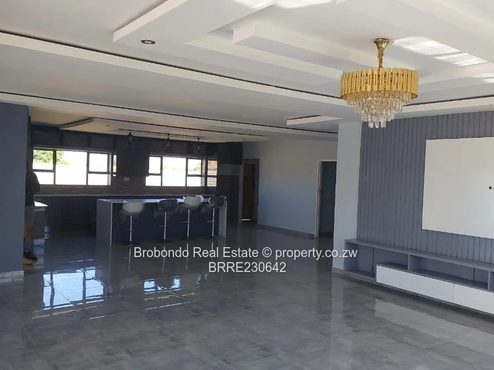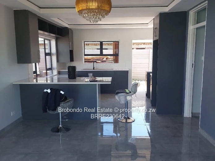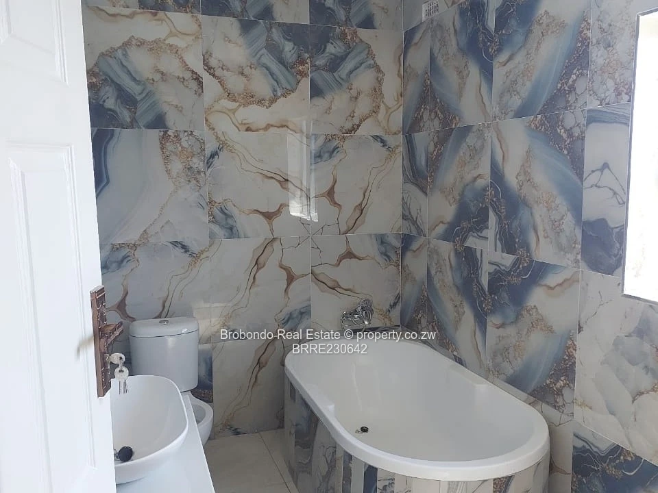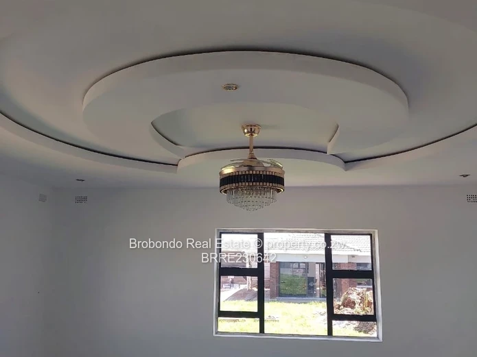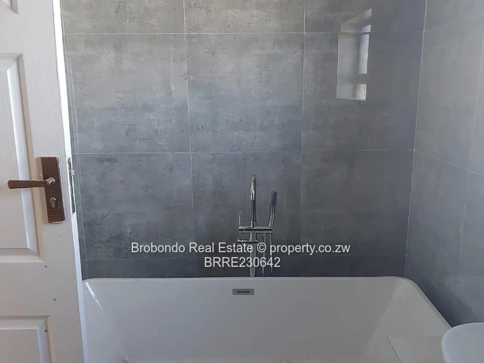 Brobondo Real Estate is proud to offer this neat and recently built 5 bedroomed house with three (3) ensuites, open plan lounge, fitted kitchen and dining, breakfast nuke, scullery, pantry, family ensuites with shower cubicles and tubs, toilet and bathroom, master bedroom with electric shower and walk in closet, tiled floors, zesa, borehole and 5000l water tank, double lockup garage, yard with water fountains, Gazebo, well maintained yard, walled and gated.
