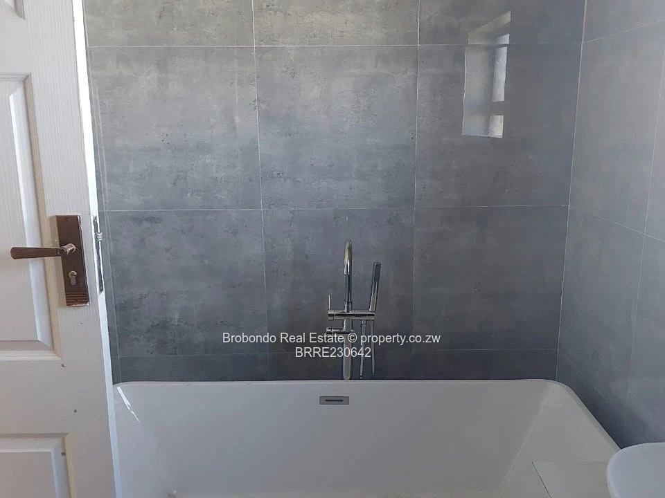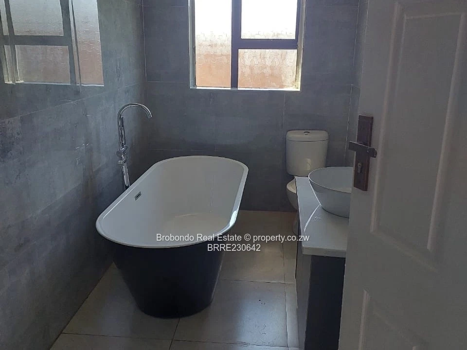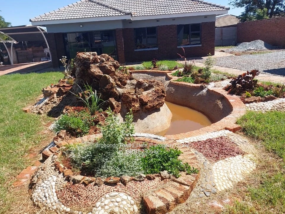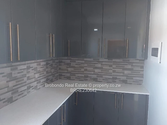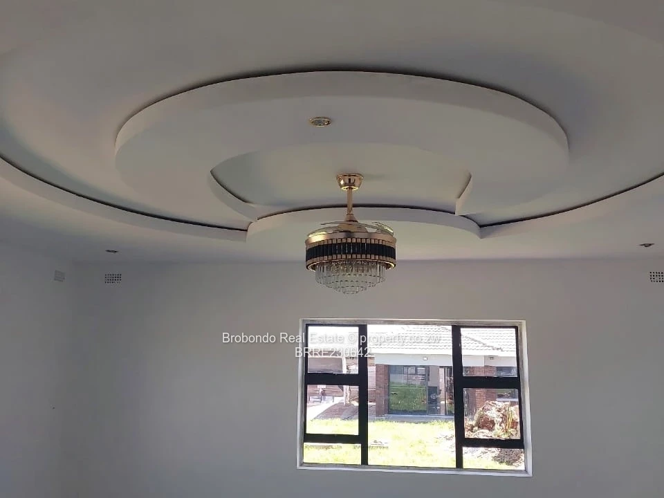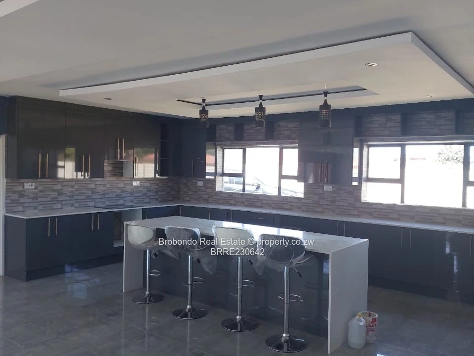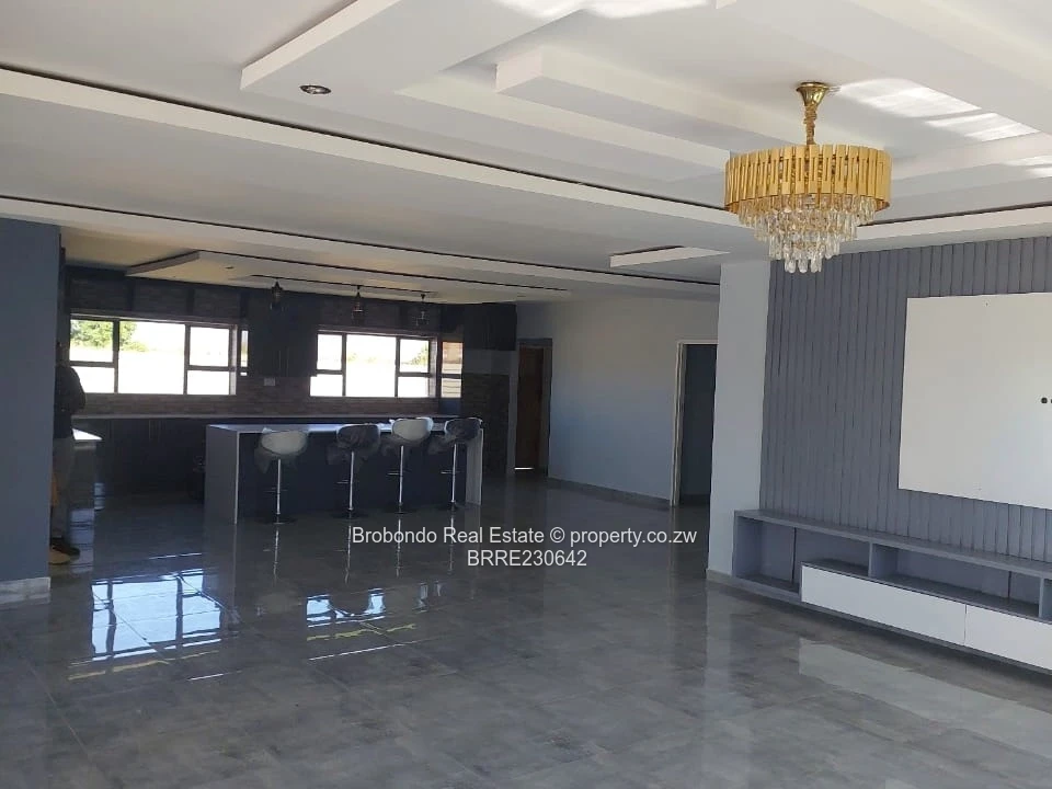 Brobondo Real Estate is proud to offer this neat and recently built 5 bedroomed house with three (3) ensuites, open plan lounge, fitted kitchen and dining, breakfast nuke, scullery, pantry, family ensuites with shower cubicles and tubs, toilet and bathroom, master bedroom with electric shower and walk in closet, tiled floors, zesa, borehole and 5000l water tank, double lockup garage, yard with water fountains, Gazebo, well maintained yard, walled and gated.