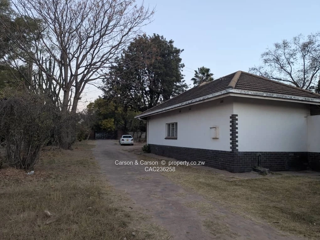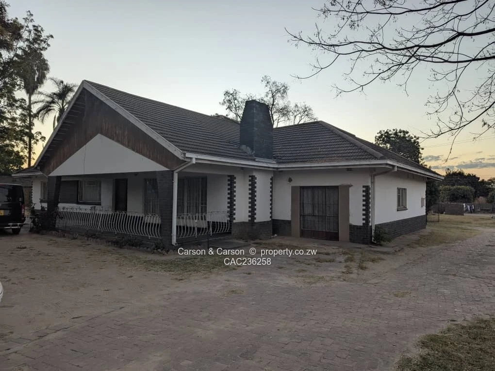 The home’s exterior features enduring tiled rooflines and attractive dark brick skirting; a covered verandah and paved entertainment area at the rear are perfect for hosting weekend braais. The grounds include staff quarters and useful outbuildings visible in the yard, plus plenty of open space for children to play or for development. Municipal water is connected and the property benefits from good ZESA supply and main road frontage for easy access and visibility.