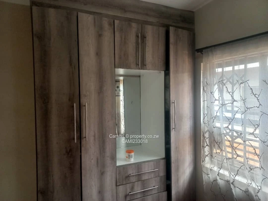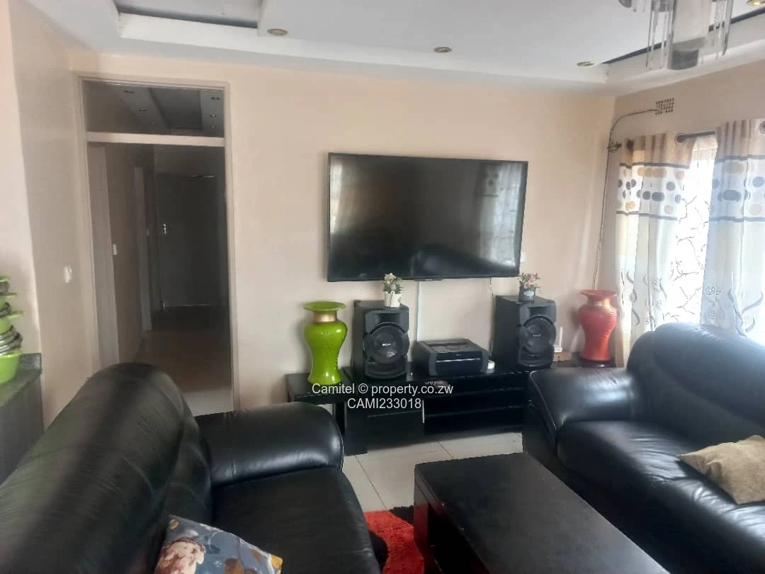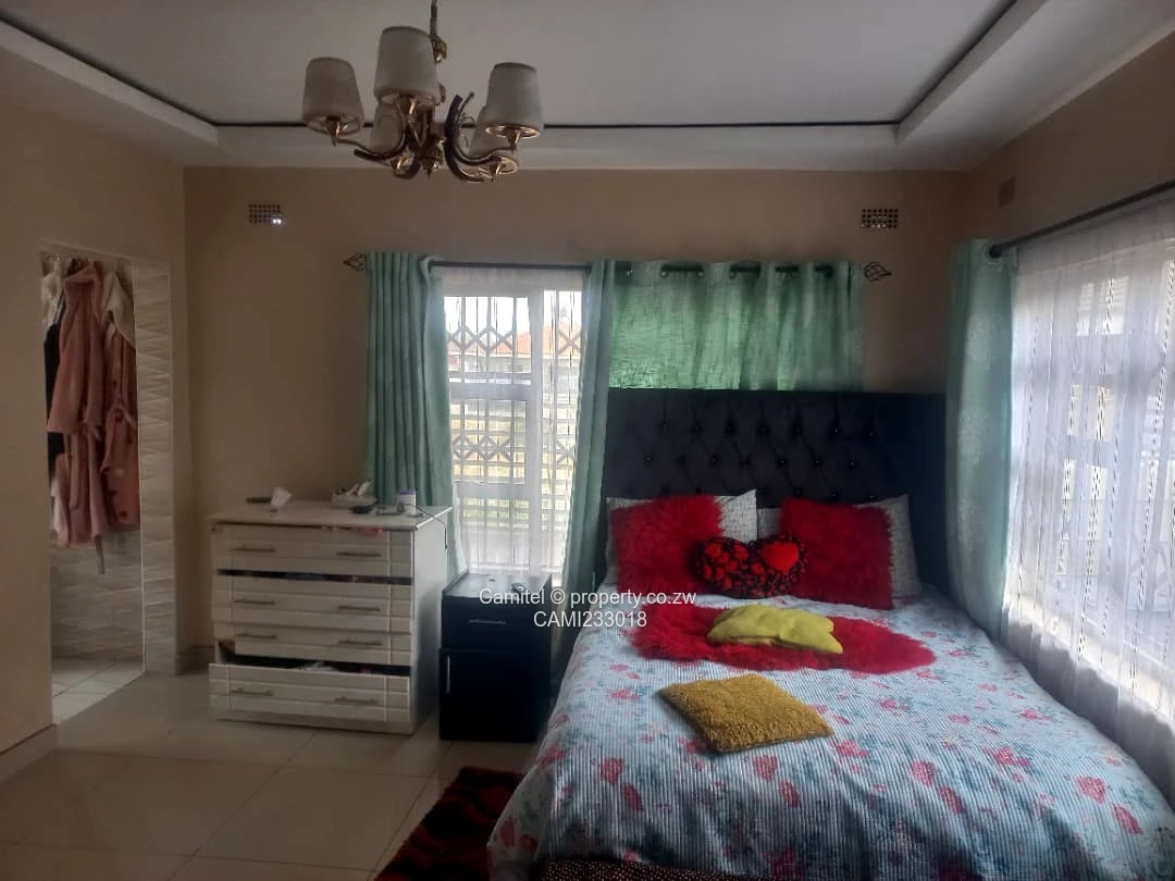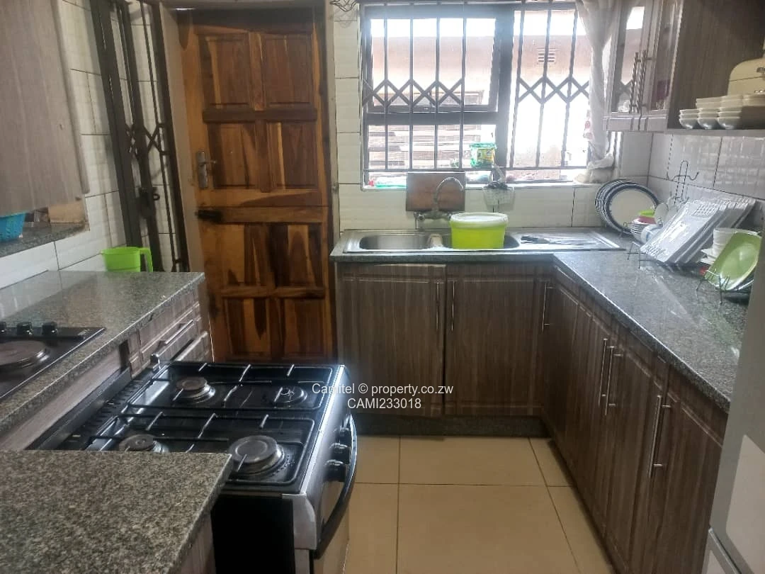 Charming 3-bedroom, 2-bathroom home for sale in Aspindale Park, Harare West — perfect for families or investors. Set on a compact 200 m² stand with a 154 m² building footprint, this solid brick home offers low-maintenance living and practical finishes. The exterior features a neat paved courtyard and secure perimeter with metal fencing (see photos), plus an IBC tank fed by a borehole for reliable water supply. Interior highlights include a modern fitted kitchen with granite countertops, plentiful cabinetry and a freestanding gas stove, a bright lounge with a mounted TV and comfortable seating area, and a hallway with contemporary recessed lighting. Bedrooms are fitted with built-in wardrobes and large windows protected by security bars; the main bathroom is fully tiled and includes a bathtub. The property benefits from paved walkways, cabinetry in all rooms, tiled flooring throughout, and clear potential for a small outdoor garden or additional parking. Well-located in Aspindale Park near schools, shops and transport routes — move-in ready with immediate occupation possible. Arrange your viewing today to appreciate the practical layout and dependable borehole supply.
