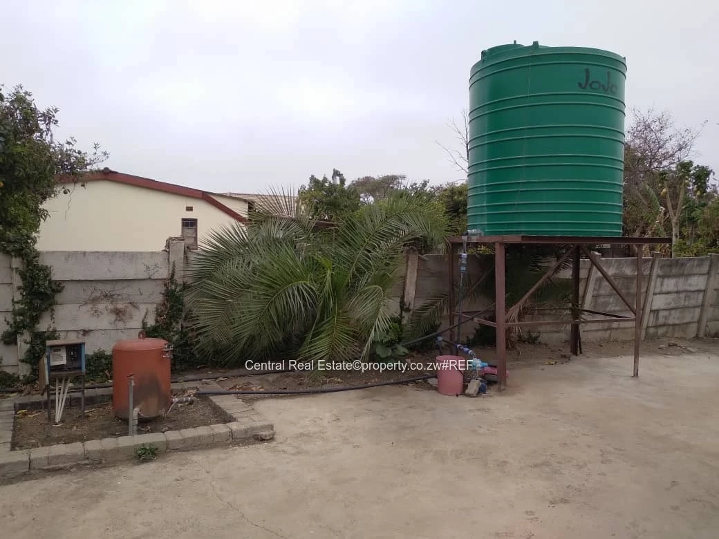 House for Sale — Northlea, Gweru (Midlands). Spacious single-storey family home on a generous 910 m² stand with 4 bedrooms and 2 bathrooms. As pictured, the property presents a well-proportioned cream exterior with red trim, protective burglar bars on windows and a secure metal garage/utility door. The large paved yard and concrete driveway offer abundant off-street parking and easy maintenance, plus a covered carport and room for expansion or a garden. Roof mounting shows a solar water heating cylinder and panel for hot water efficiency, and an elevated JoJo tank at the rear ensures good water storage. The covered front veranda and side entrance create practical flow; there is also an external storeroom and space suitable for a workshop or granny flat. Ideal for families or investors seeking a solid, secure home in a peaceful Northlea neighbourhood — ready to move into with scope for modernisation to add value. Contact to arrange a viewing.