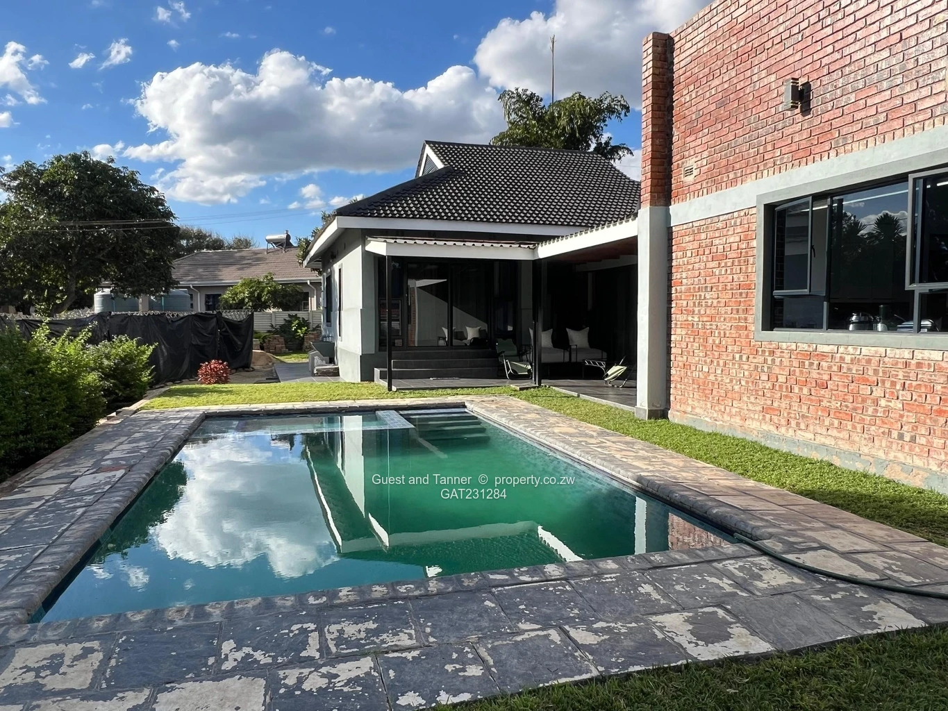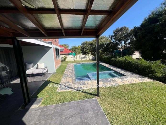 The main house features a bright open-plan lounge and dining area, a fitted kitchen with scullery, and four generously sized bedrooms. Outdoors, enjoy a mature garden, sparkling swimming pool, and ample space for entertaining.