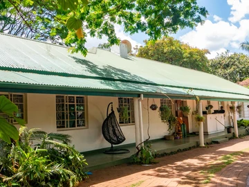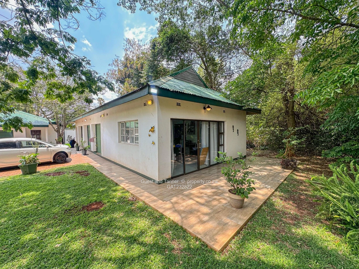 The property features five bedrooms with built-in closets, a lounge with a fireplace, a guest wing, a common bathroom, a fitted kitchen, and a verandah. Additionally, there is a four-lock-up garage, a laundry room, and two store rooms. The property also includes a one-bedsitter cottage and two-roomed staff quarters with an ensuite and a common bathroom.