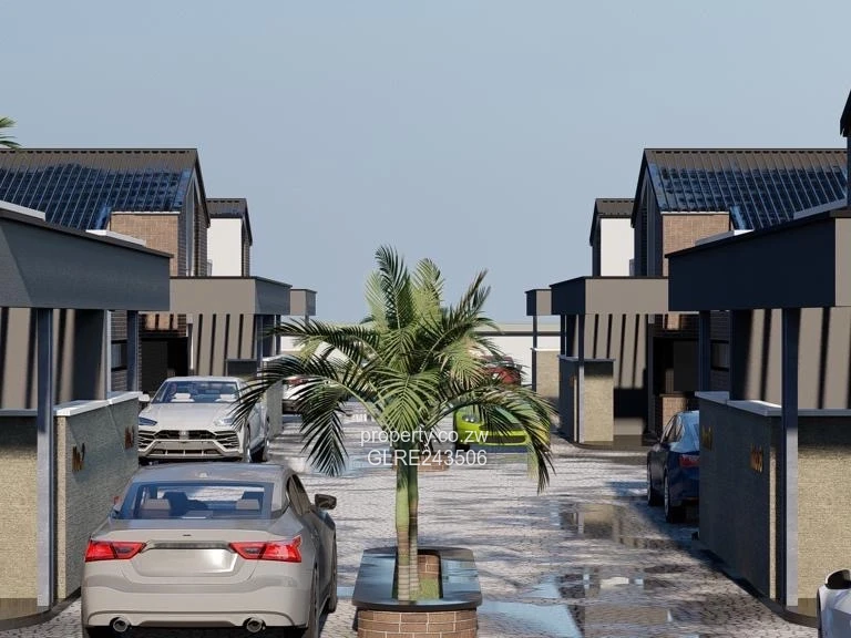 Open-plan living spaces and neutral timber-effect flooring create a versatile canvas for contemporary furnishings. The property is set within a secure development made up of neatly arranged units with paved driveways and dedicated parking bays, shown in the site image with landscaped palms and clear access for vehicles. Practical extras include a reliable borehole for steady water supply and ample outdoor space for expansion, entertainment or a veggie garden.
