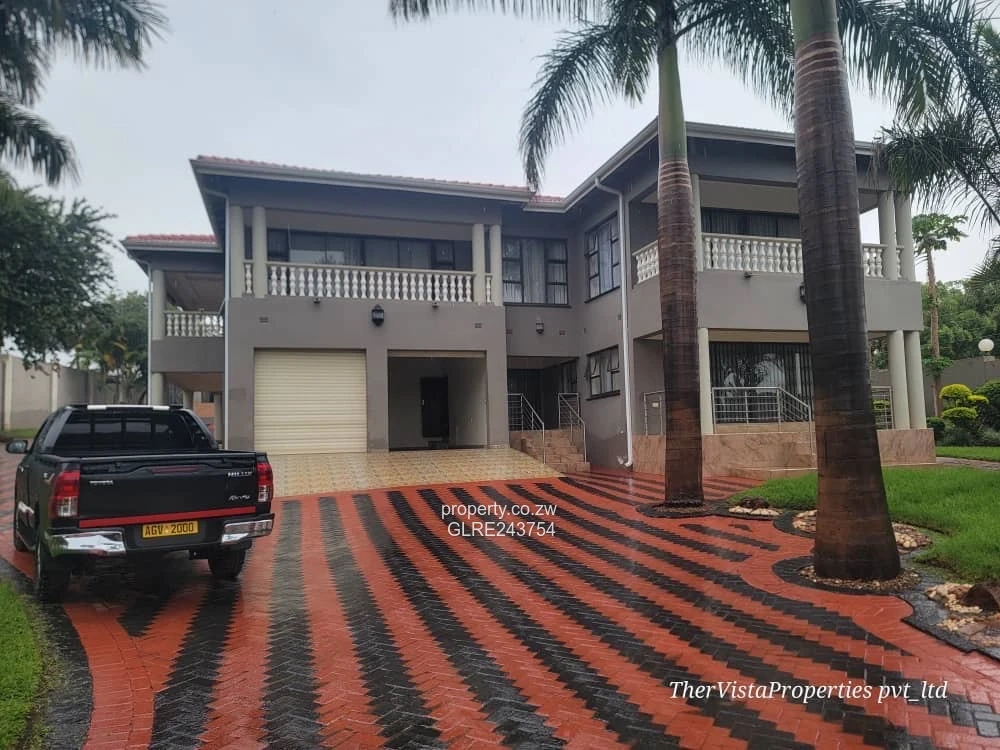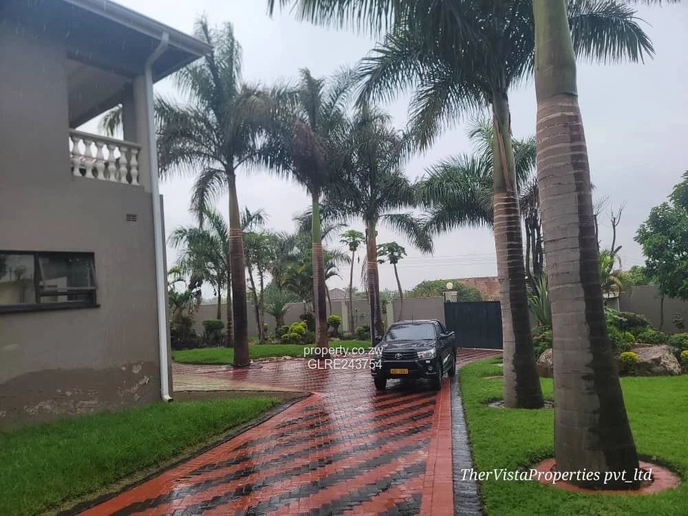 Stunning family residence in Pomona, Harare North — a generously proportioned 6-bedroom, 5-bathroom home on a 1,900 m² stand with approximately 800 m² of built space. As seen in the photos, the property greets you with a striking red-and-black patterned paved driveway that accommodates multiple vehicles and leads to a double garage with roller doors and a covered carport/outbuilding. The house exterior features elegant grey render, a red tiled roof and a balcony with classic balustrade overlooking the landscaped gardens. Mature palms, manicured lawns and neatly trimmed shrubs create a private, green oasis framed by high perimeter walls.