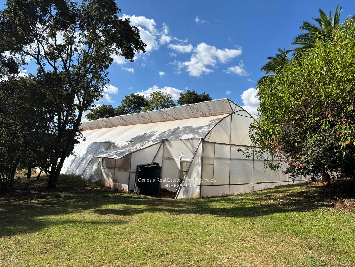 The expansive grounds feature a well-established garden, a sparkling swimming pool, and three greenhouses, making it ideal for gardening enthusiasts or small-scale horticulture.