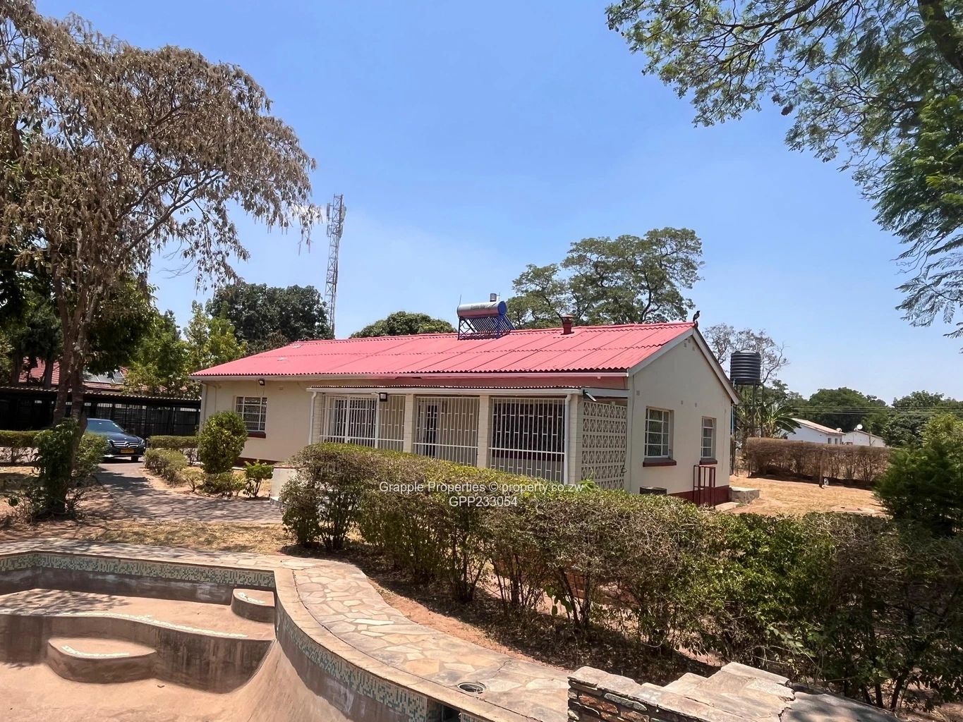 Key features comprise; a main house with 4 bedrooms, built-in cupboards, recent interior and exterior paintwork, solar geyser, and a carport accommodating six cars. Additionally, there is a standalone 1 bed-roomed cottage with built-in cupboards and a solar geyser. The property occupies 4,700 square meters, complete with a borehole, a swimming pool in need of repair, and a walled and gated yard.