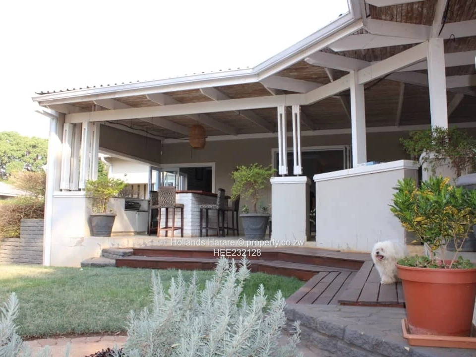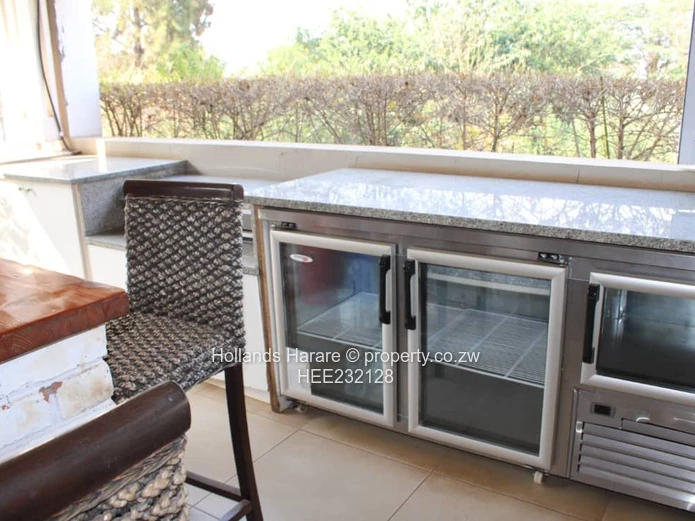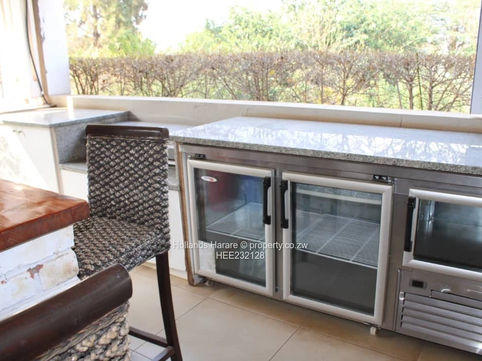 Cozy TV lounge with free standing Jetmaster fireplace. Second spacious lounge flowing into an open plan kitchen with walk in pantry & separate scullery. Fold back glass doors open onto a large covered verandah with built-in braai and bar area,