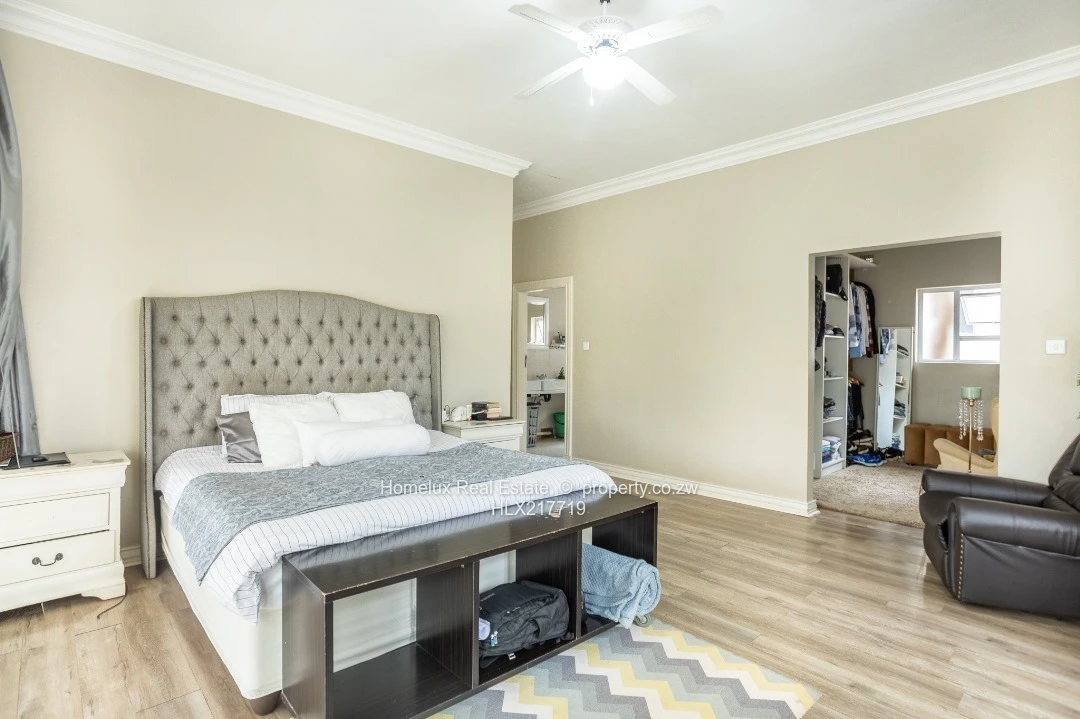 The main bedroom features an ensuite with a Jacuzzi tub, a shower area, and a water closet. It also includes a walk-in closet with his and hers shelving, and a ceiling fan for comfort.