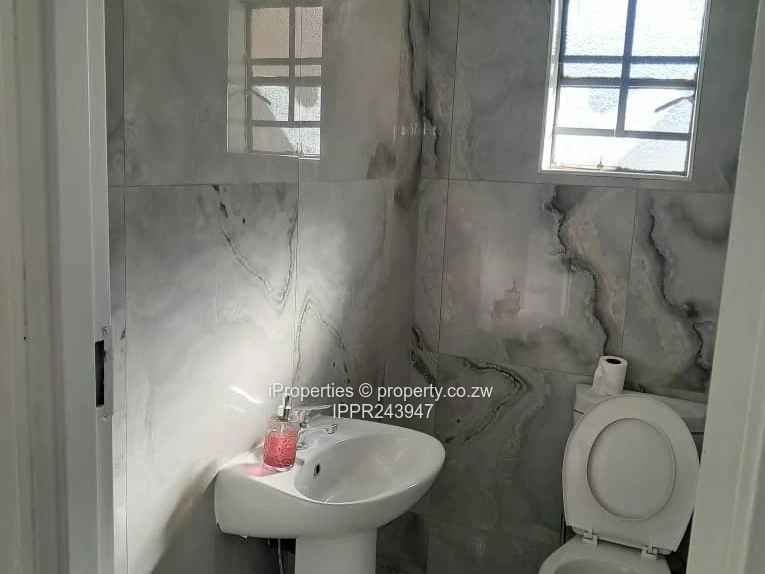 A 3-bedroom house for sale in Mainway Meadows, Harare South, on a neat 570 m² stand. This secure, walled home is ready to move into—tiled throughout. The fitted kitchen has white cabinetry and warm wooden worktops. The main en suite and family bathroom are modern: marble-effect tiles, a glass shower enclosure, and a separate bathtub give a spa-like feel.