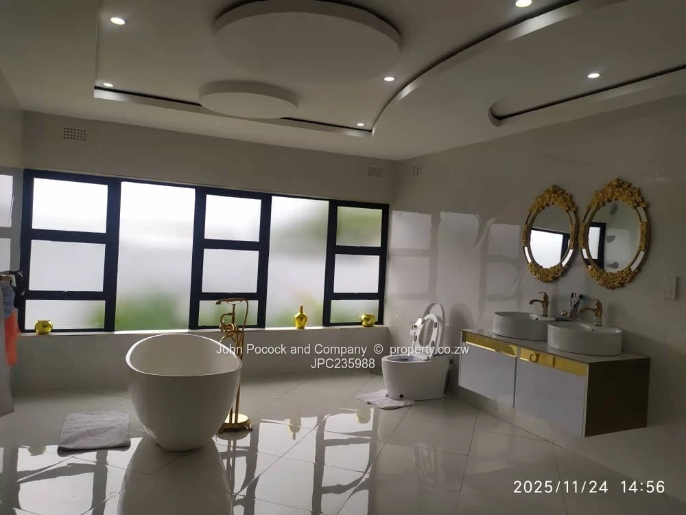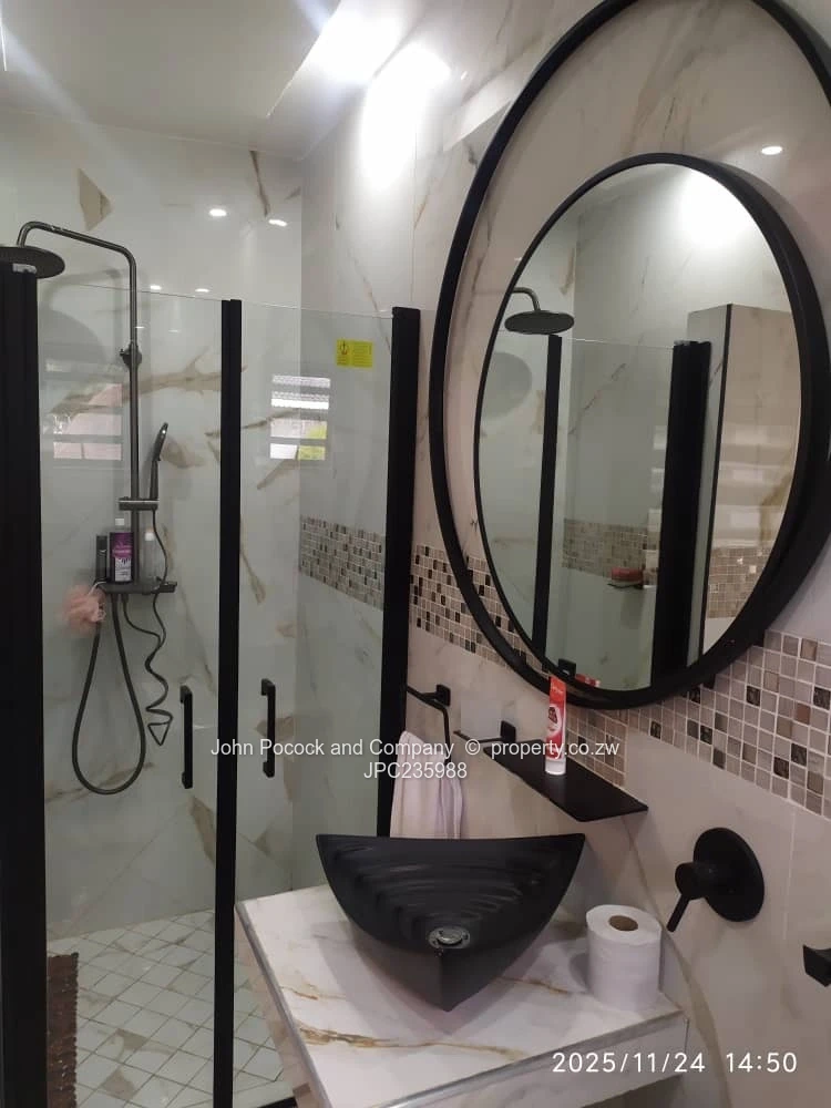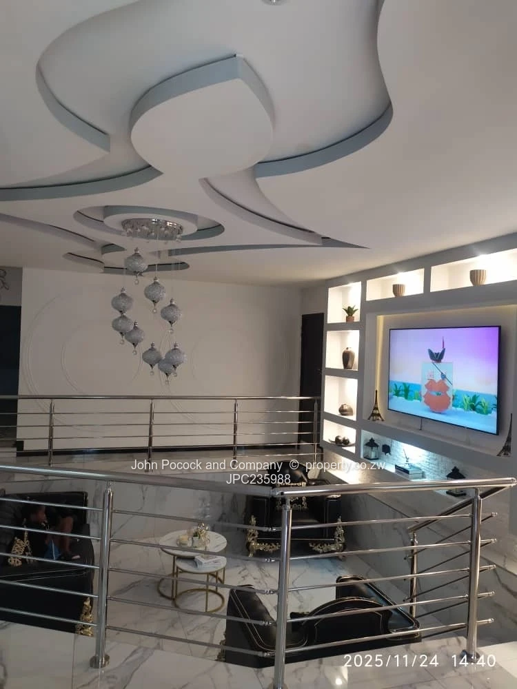 Stunning fully furnished 4-bedroom, 5-bathroom family home for sale in Ilanda, Bulawayo East set on a generous 2,259 m² stand. Designed for effortless entertaining, the property features a crystal-clear swimming pool with fire pit water features so pleasing to the eye, a spacious gazebo with braai and bar perfect for entertaining and adjoining covered veranda that opens from the main living areas—perfect for weekend braais and poolside gatherings. The contemporary open-plan kitchen is a chef’s delight with a central island, integrated ovens, glass-fronted display cabinetry and premium finishes. Luxurious marble-look floors, designer recessed ceilings and statement lighting flow throughout the reception rooms for an elegant, modern feel.