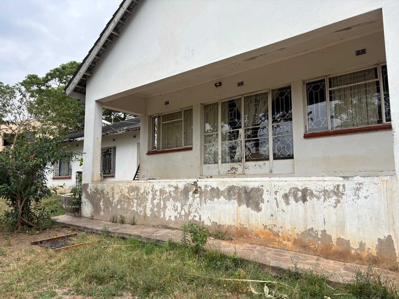 Inside, the home offers generous room proportions and character: an open living area with a focal fireplace, large windows that fill rooms with light, and built-in kitchen cupboards visible in the separate kitchen. Two bathrooms are tiled and functional — one with a bathtub — while other rooms show timber finishes and original features that can be restored. Photographs reveal some ceiling and roofboard work required and areas needing cosmetic renovation, giving a buyer the chance to add value through refurbishment or a complete modern redesign.