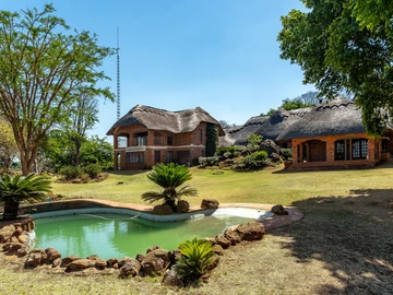 In total this large 4.5 acre property has 8 bedrooms, 6 bathrooms (with 3 outdoor showers), 4 kitchens, and 4 lounge areas. A swimming pool, large kids playground, mini grass tennis court, 2 boreholes, double garage, separate laundry, 7 domestic quarters and 3 storage rooms. The house also has a large work shop, an art studio and plant nursery. One of the main unique aspects of this property are its magnificent gardens with multiple water features and courtyard gardens through-out the property. There is a 12kva solar system for the main house and a 5kva system for the apartment as well as a smaller systems for the cottage. This is backed up by a 16kva generator.