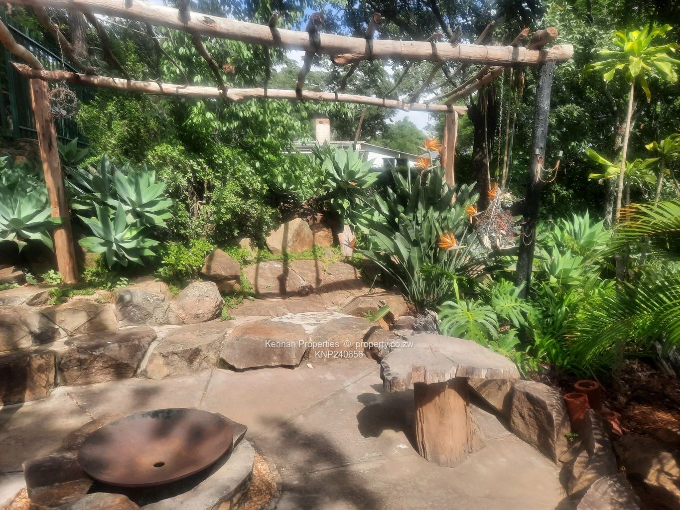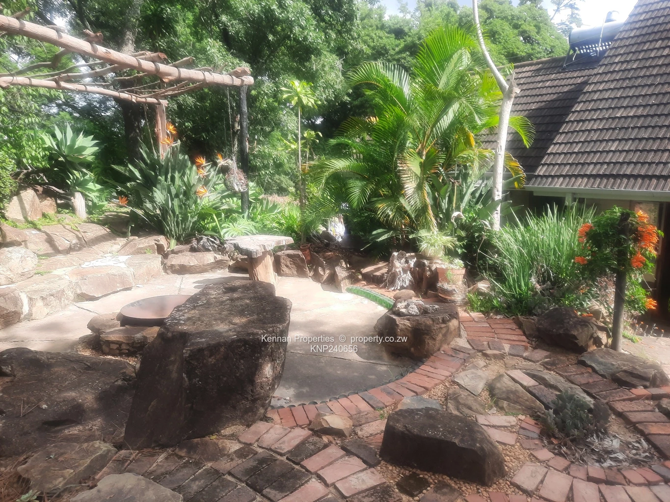 good and the swimming pool is set amongst the trees.There are many delightful features in this much loved and sculpted rocky garden, with a flat area at the top of the property – the site of an old tennis court. There are two solar geysers, 8 solar panels and an inverter and water storage tanks. The property is very well secured.