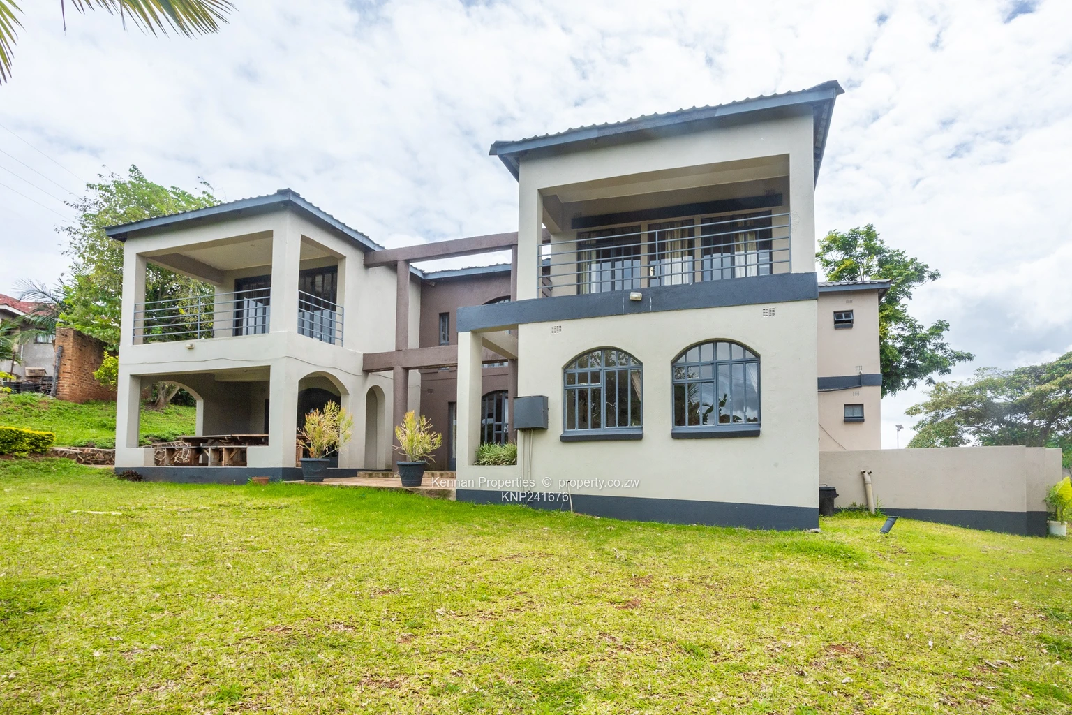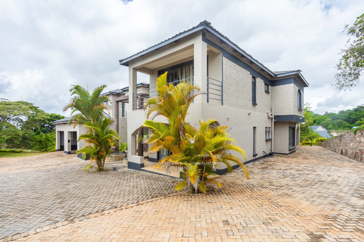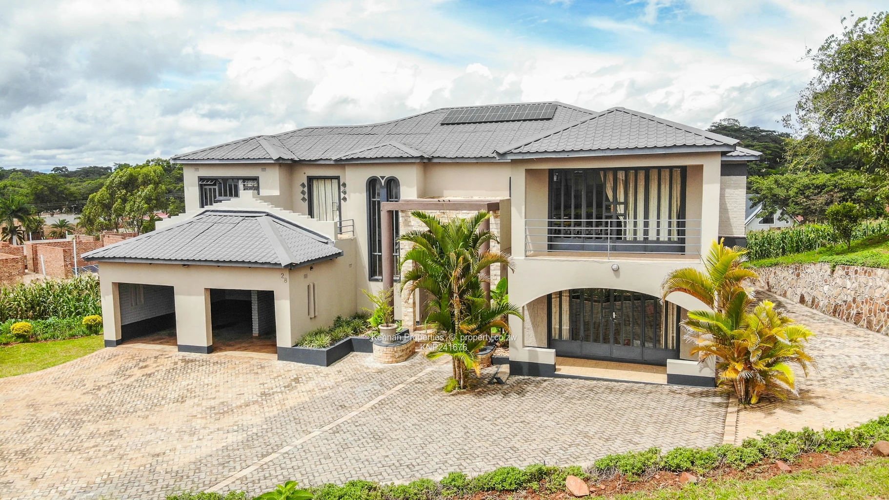 Situated on an elevated 2,700sqm stand with open views, this double storey home offers generous space and practical family living. Upstairs comprises four ensuite bedrooms, each opening onto a balcony, with an additional lounge serving the upper level. Downstairs features a fifth bedroom suitable for guests, an open plan fitted kitchen and dining area, a main lounge and a second lounge opening onto a veranda overlooking the entertainment area. The home also includes a study, entrance hall, guest toilet and basin, and a fully ensuite staff room. Additional features include a double garage, borehole, 5,000 litre water tank, and 5KVA solar system, all set within a well maintained garden.Soni