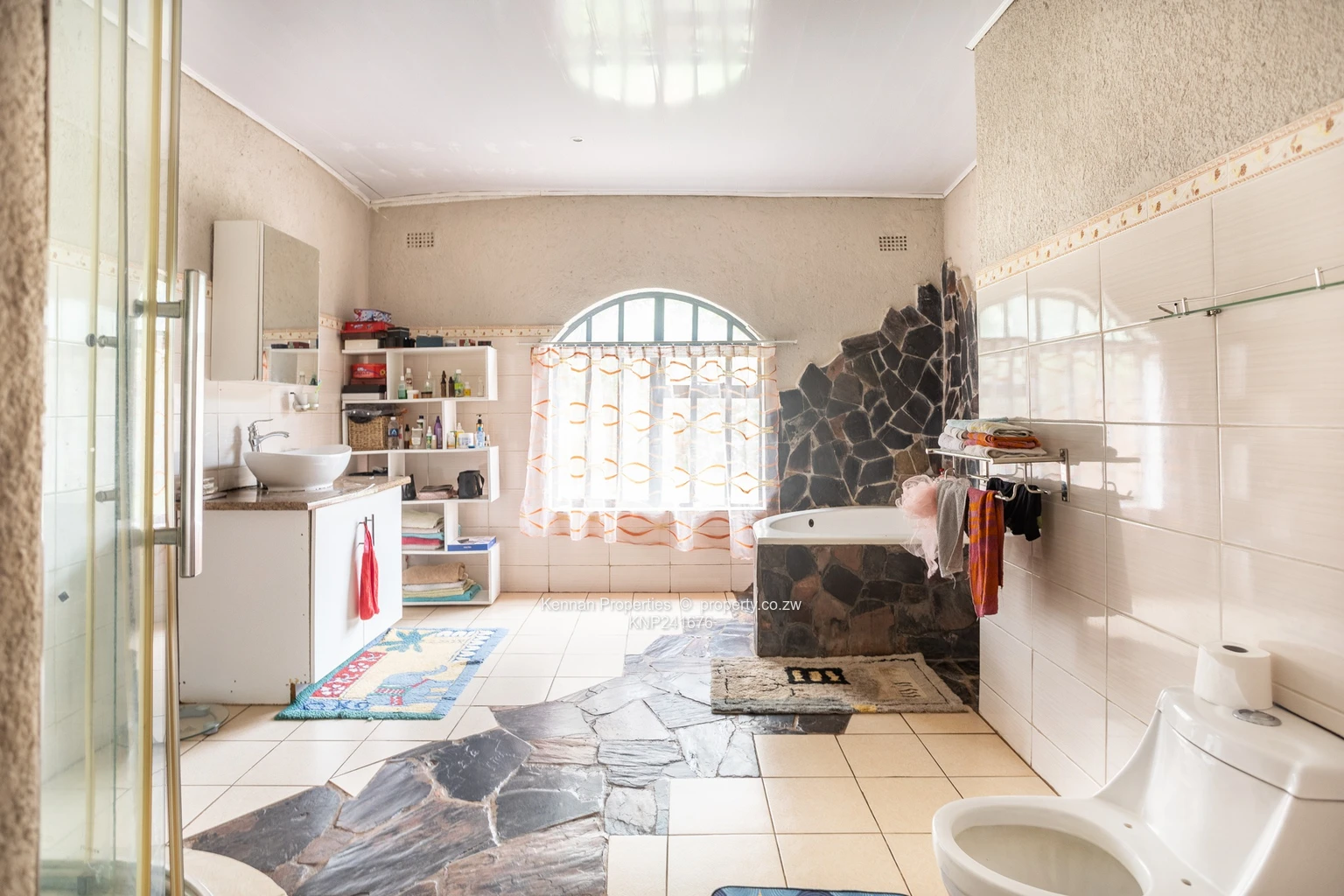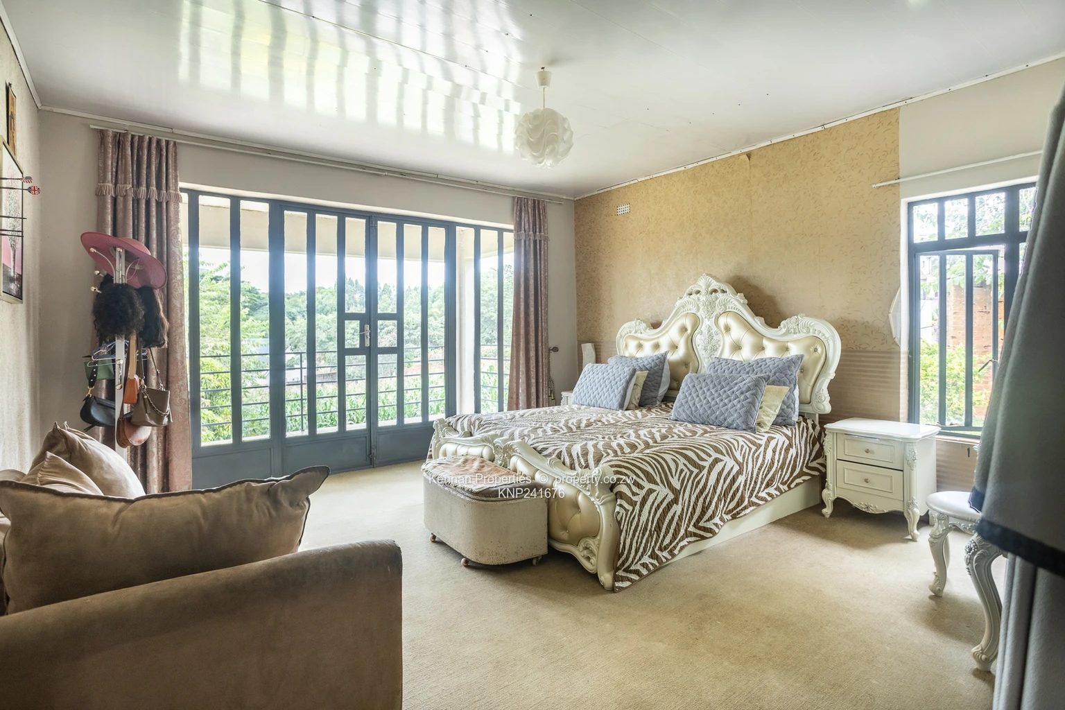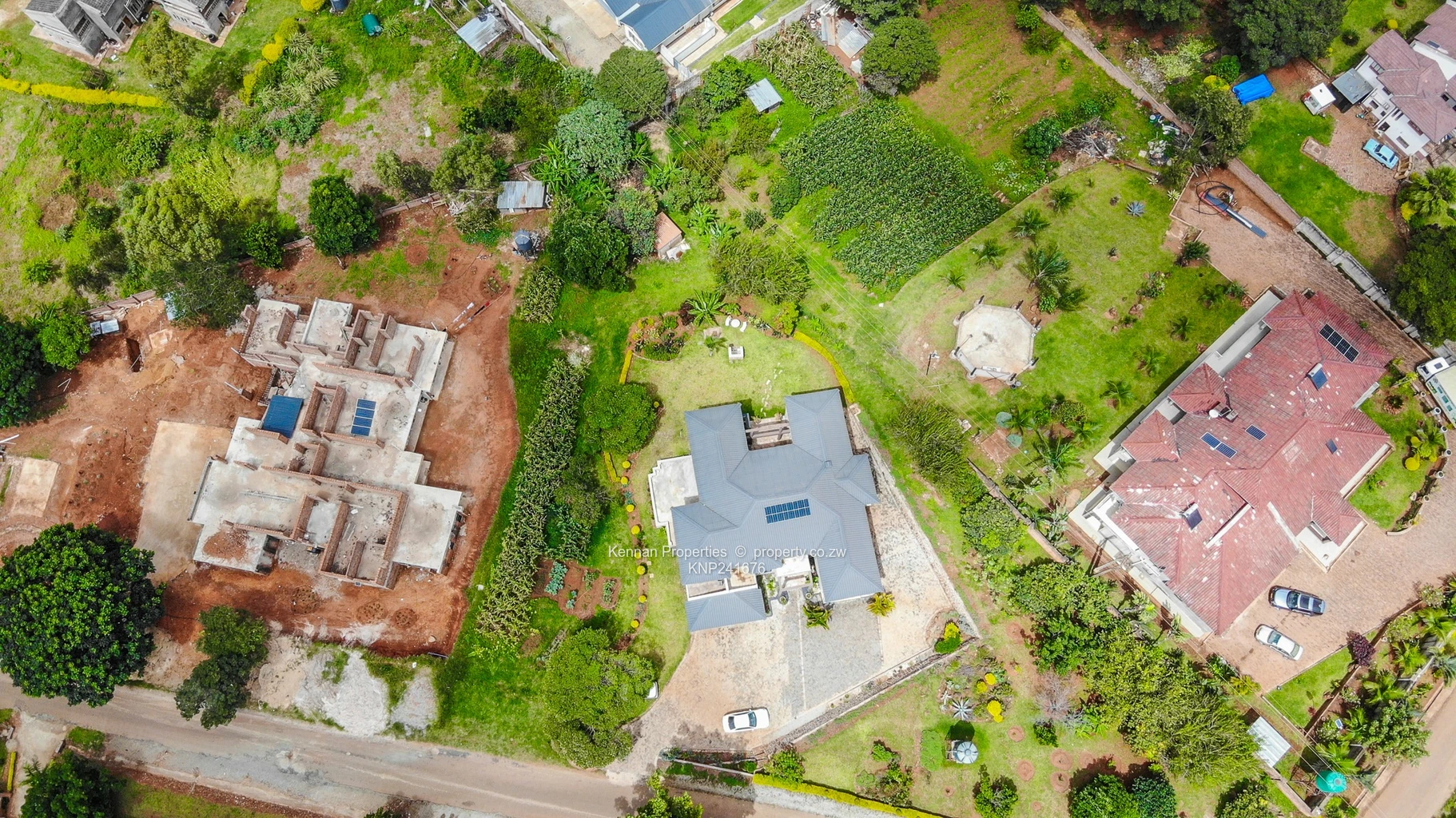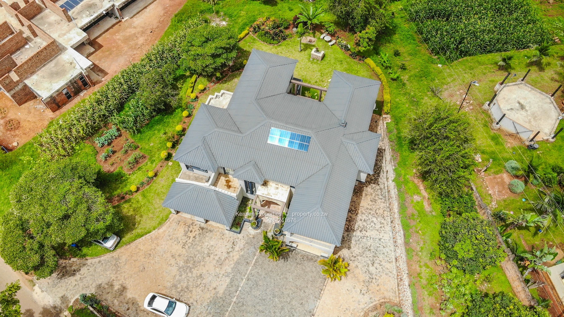 Situated on an elevated 2,700sqm stand with open views, this double storey home offers generous space and practical family living. Upstairs comprises four ensuite bedrooms, each opening onto a balcony, with an additional lounge serving the upper level. Downstairs features a fifth bedroom suitable for guests, an open plan fitted kitchen and dining area, a main lounge and a second lounge opening onto a veranda overlooking the entertainment area. The home also includes a study, entrance hall, guest toilet and basin, and a fully ensuite staff room. Additional features include a double garage, borehole, 5,000 litre water tank, and 5KVA solar system, all set within a well maintained garden.Soni