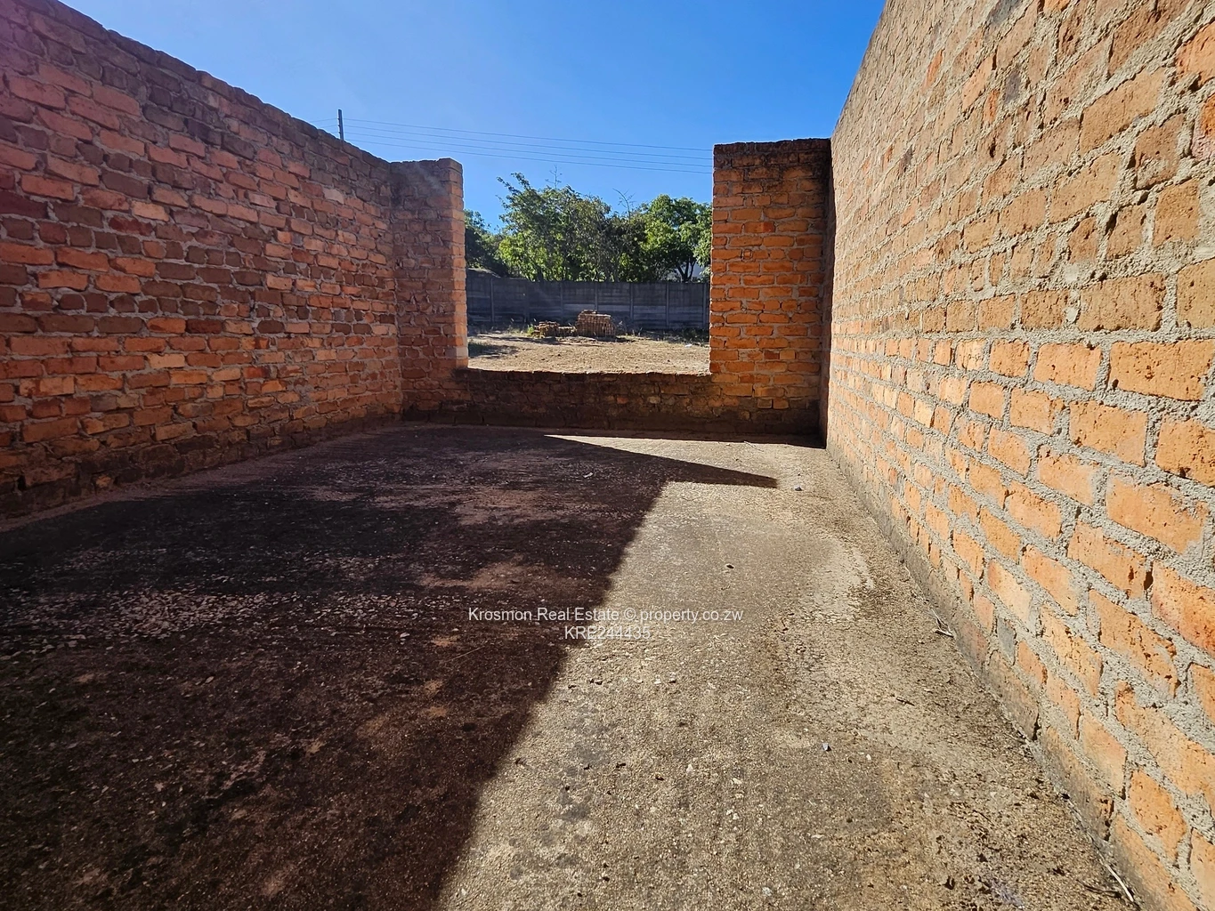 Rare opportunity in Ruzawi park Marondera: a spacious 2075 m² stand with a 300 m² four-bedroom, two-bathroom house shell ready for completion. As seen in the photos, the property features solid brick walls, concrete floors and foundation work already in place — a practical head start for a buyer who wants to finish to their own specification. The plot is fully defined with a perimeter wall and secure access control already established, giving immediate privacy and peace of mind. There is generous space for a covered carport and parking, with existing pillars and level ground suitable for constructing a sheltered vehicle area. Mature trees and open yard space provide scope for an expansive garden, additional outbuildings or entertainment areas. Convenient street access and visible service connections make this a straightforward project for a family home or an investor seeking a high-potential build in Mashonaland East. Secure, central Marondera location, four bedrooms and two bathrooms planned within the 300 m² footprint — bring your builder and imagination. Contact now to view and take over this move-in-potential project.