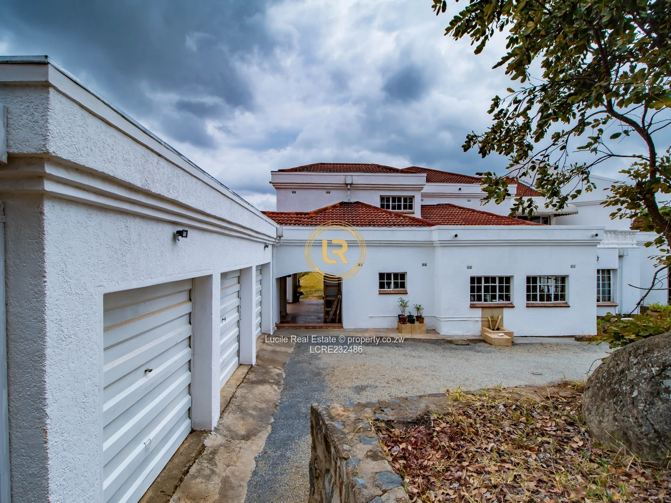 A secure three-lockup garage with additional cottage-style quarters.