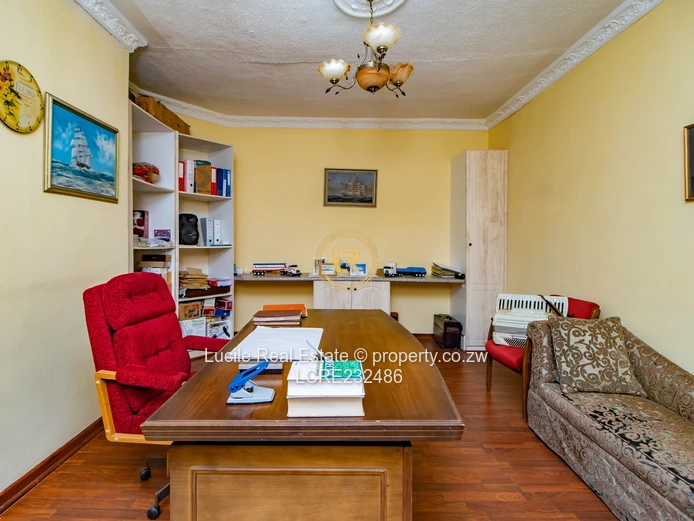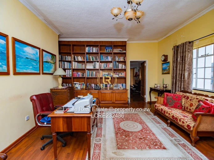 Large and small offices with fireplace upstairs and library.