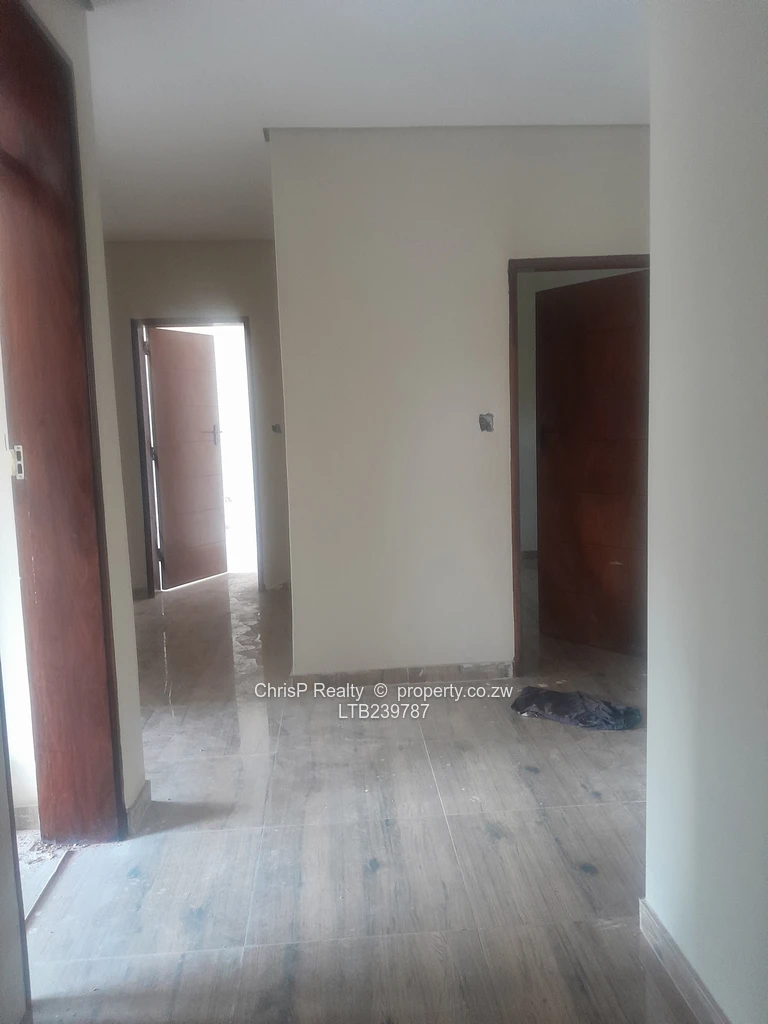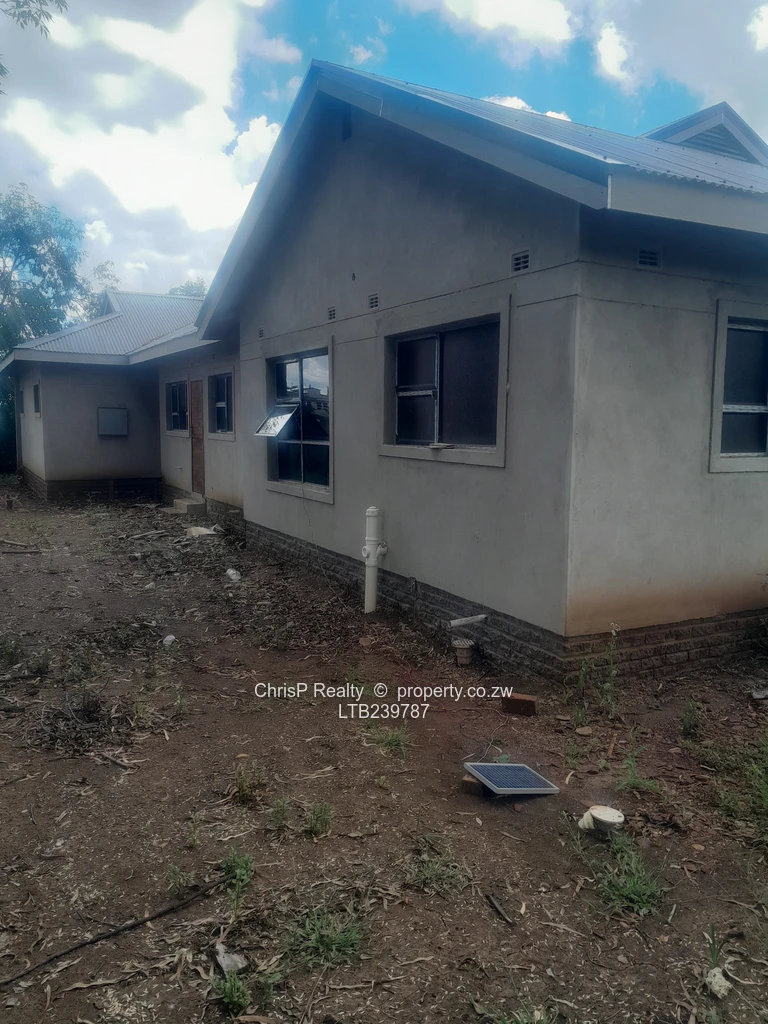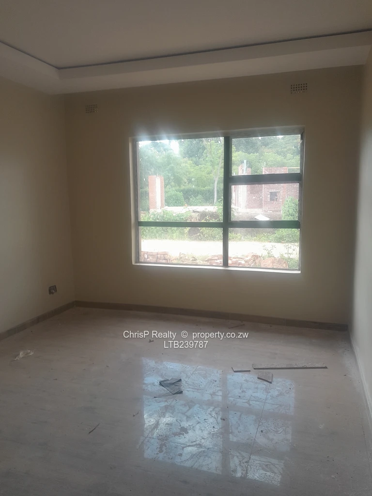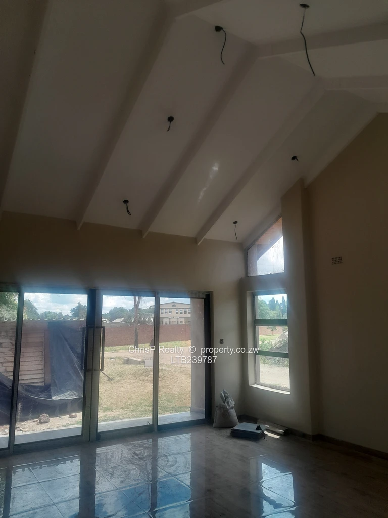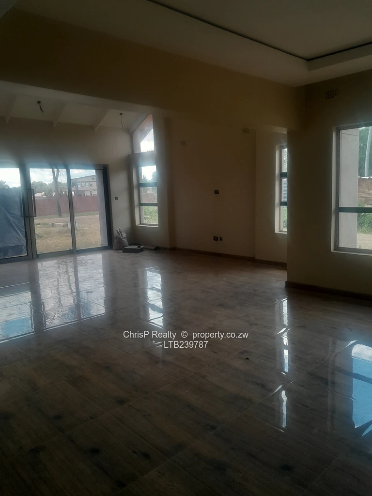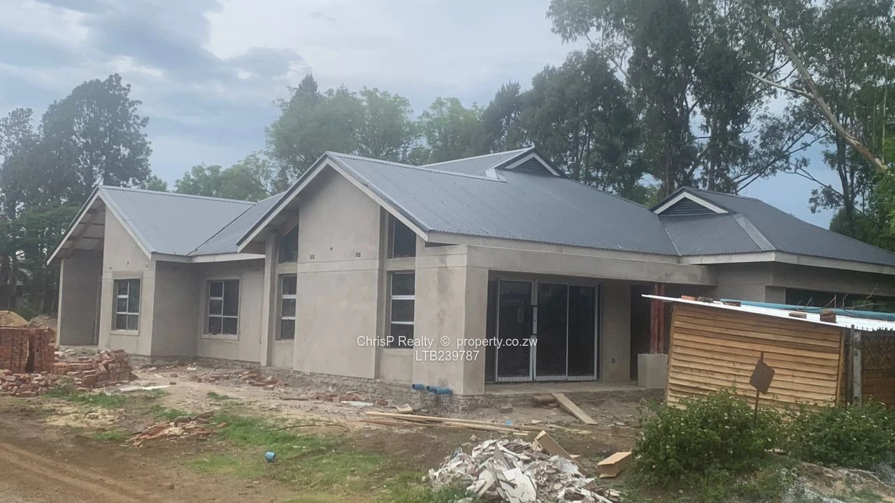 Brand new architecturally designed house with some high ceilings for enhanced ventilation. Located directly opposite a prestigious private day and boarding school and conveniently close to social amenities that include a private hospital, a satellite clinic,shopping centre, public schools , plentifull public transport (Good roads). Accommodation comprises open plan lounge, dining room, kitchen, scullery and walk in pantry. 4 bedrooms main with ensuite bathroom and dress area. Double lock up garage.Minor finishes to taste: Include: [light fittings, wc's, wash hand basins,kitchen cabinets, shower fittings plus exterior painting and landscaping]. .Borehole siting was done. Ready for title deed. [ To be transferred directly to purchaser upon payment] Price guide: Usd 120000 ( Neg).