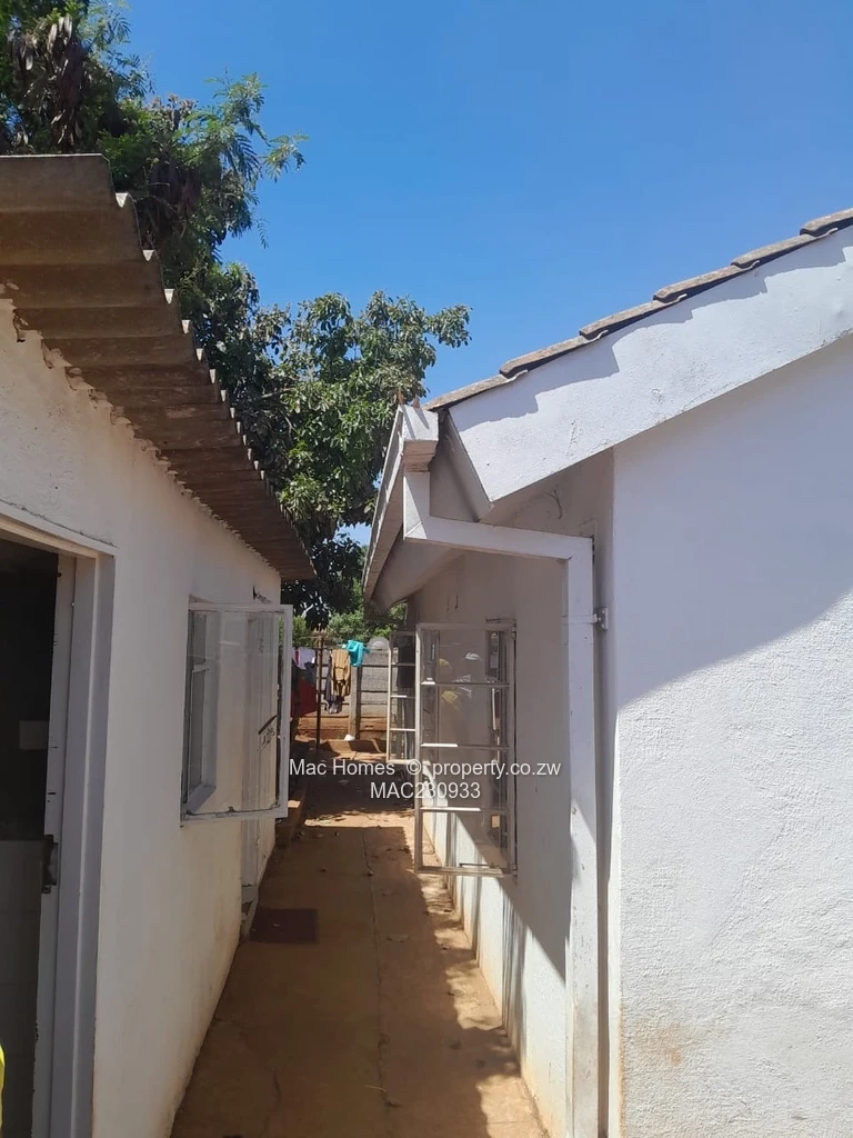 Spacious 4-bedroom, 2-bathroom family home in New Marlborough, Harare West — standing on a 600 m² plot. The property offers a large, airy lounge with decorative ceiling detail and wide windows that flood the room with light, tiled floors through the main traffic areas and a practical kitchen with fitted cupboards visible from the living area. Bedrooms are comfortable in size with curtain-fitted windows and secure burglar bars; the hallway and circulation spaces are fully tiled for easy maintenance. The main bathroom features a bathtub and tiled splashback while fittings throughout are functional and ready for simple cosmetic updating. Outside the home there is a manageable garden area ideal for vegetables or further landscaping, and the stand benefits from its own borehole — a major asset for uninterrupted water supply. The exterior shows a solid structure with tiled roof; the interior presents an excellent opportunity for renovation or immediate occupancy by a growing family. Excellent value for investors or homeowners who want a well-located, solid house with room to personalise. Contact us to arrange a viewing and see the potential up close. Walled and gated plus 2 roomed cottage, Deeds 160k usd