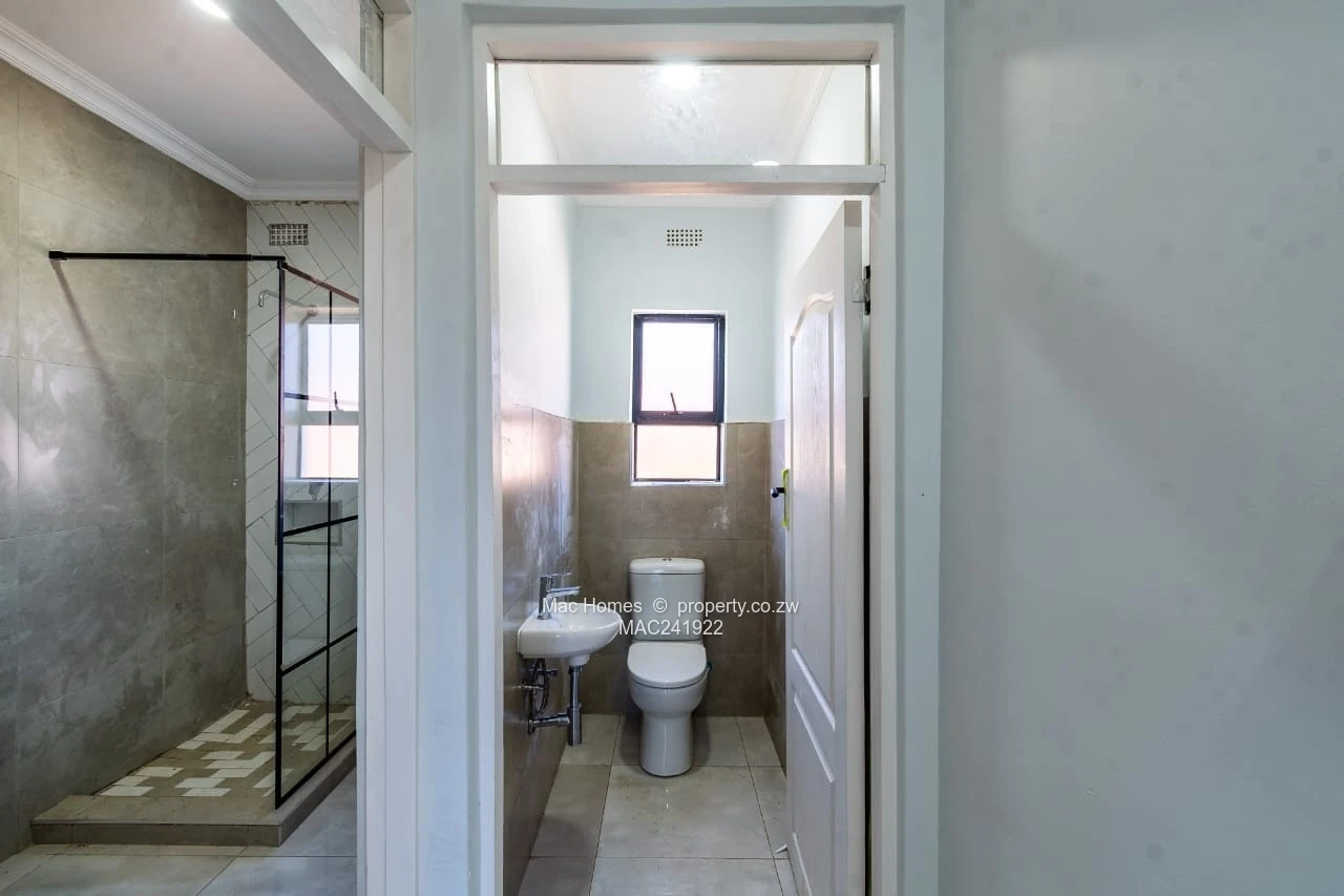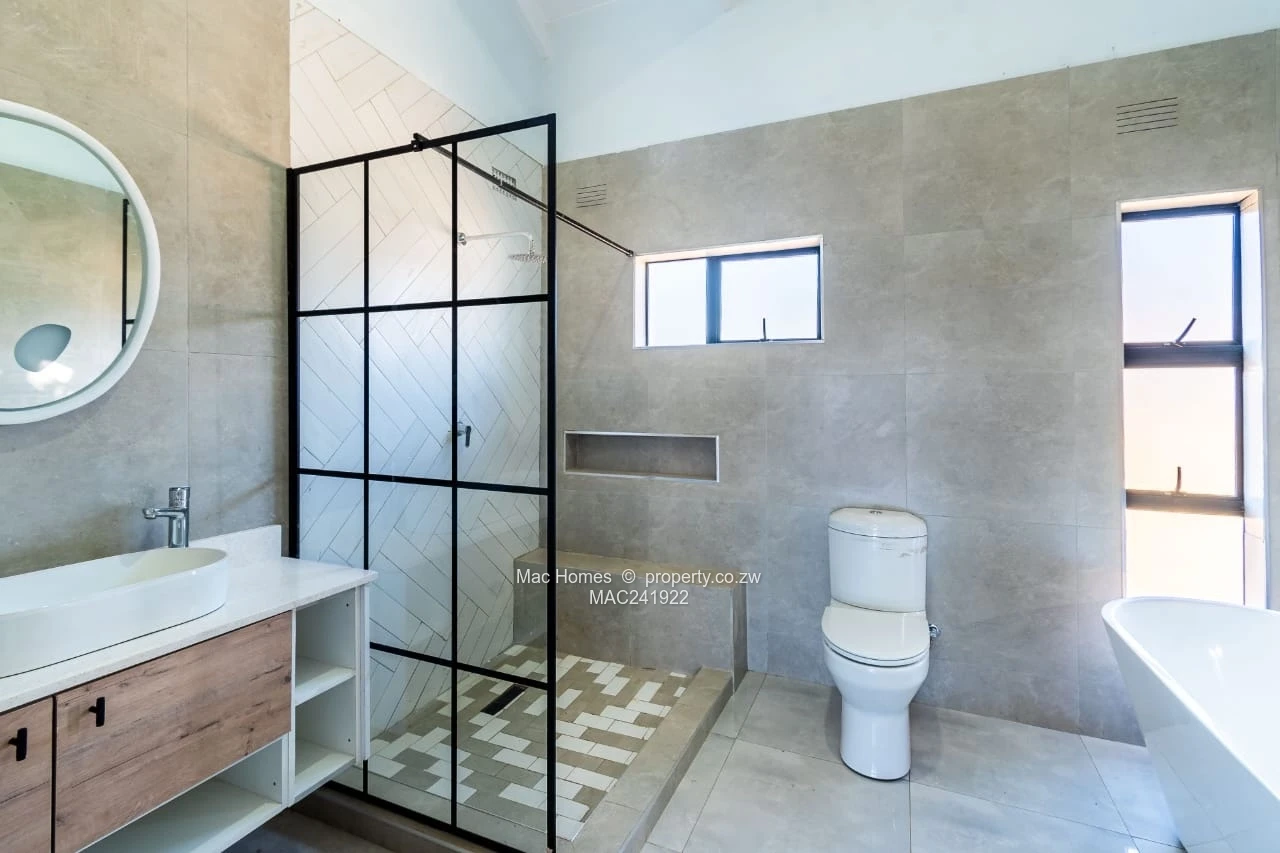 Beautiful three-bedroom, two-bathroom family home for sale in Mandara, Harare East — a rare offering on a generous 2,000 m² stand with a comfortable 190 m² of living space. The house is finished to a modern standard and built for everyday comfort and entertaining. The bathrooms are especially striking: the images show a contemporary, light-filled ensuite with a black-framed glass walk-in shower, chic neutral tiles, a timber-finish vanity with round mirror and a freestanding bath, plus a separate WC — all reflecting clean, tasteful finishes throughout.