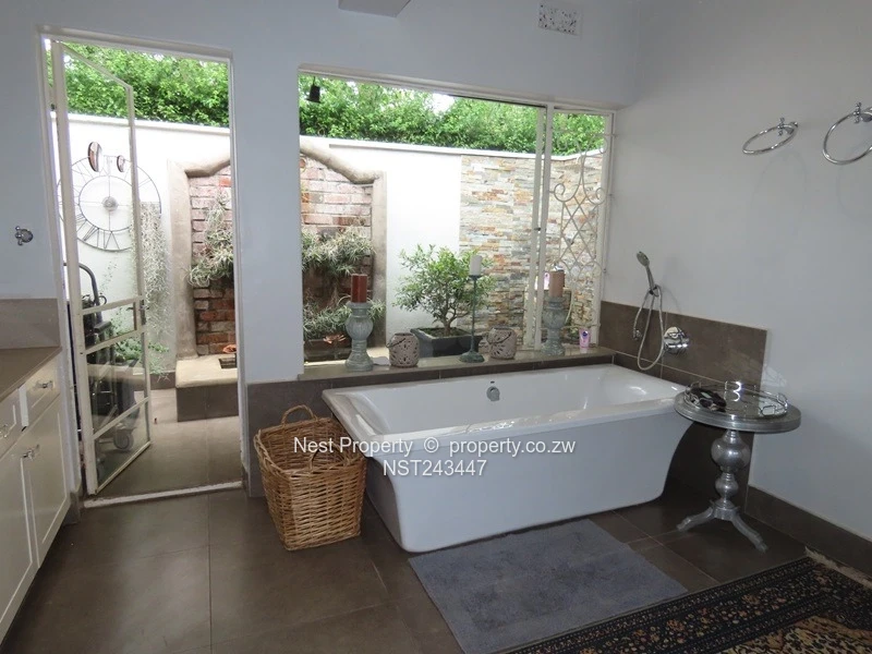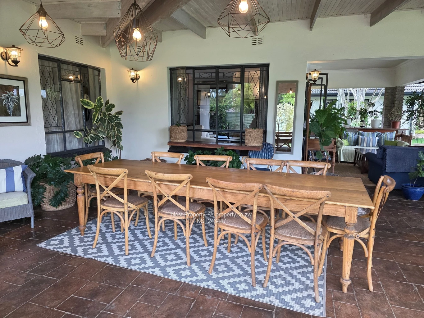 Warm, elegantly decorated Home, showcasing 4 Bedrooms and 3 Bathrooms- two Bedrooms are ensuite with the main Bedroom wing offering a dressing room, gorgeous full Bathroom with an open courtyard and outside shower. In addition, this home offers a large central open plan Lounge with fireplace, to Dining room which is further open plan to the modern Kitchen with built in electric oven and gas hob. The Kitchen has a separate scullery and overlooks its own outside courtyard. Leading off the Lounge area is a large bar/pub room as well as two connected Verandah/patio sections which are currently used as seating and dining options. The Verandah overlooks the beautiful blue pool and out onto the immaculate Garden.