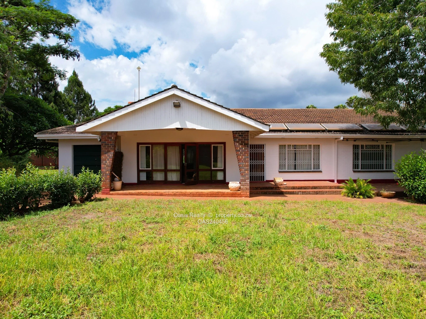 covered verandah overlooks the grounds, which include a paved driveway