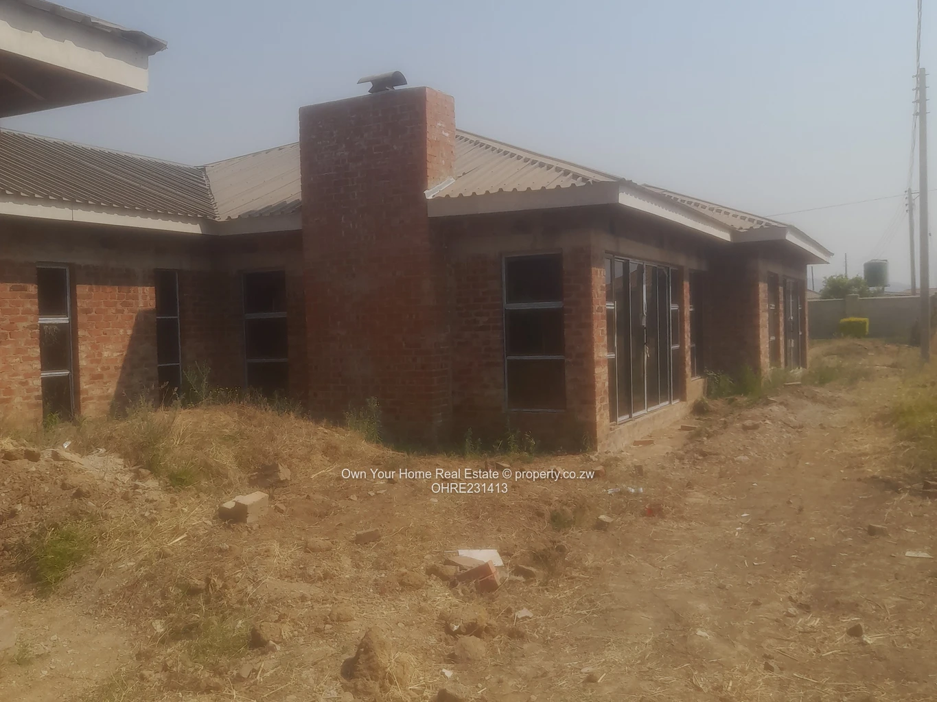 Incomplete 3 Bedrooms house main bedroom ensuite, 2 Lounges, spacious kitchen and large dining room, also a self contained 1 bedroom staff quarters, roofed but in need of finishes.Serviced with zesa, a well and gravel roads on 880m2, fenced and gated developer cession
